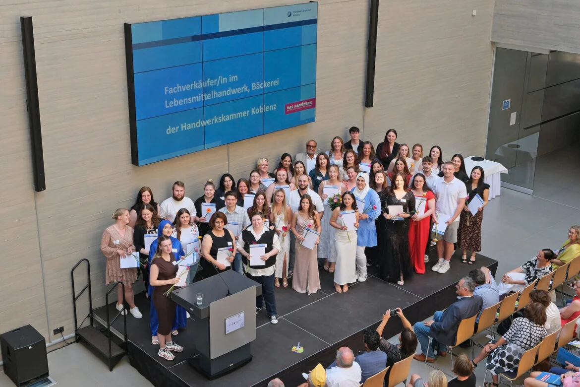 Region | 16. Juli 2025 | (ww). Feierlich, emotional und voller Stolz: Auch in diesem Sommer wurden wieder zahlreiche junge Handwerkstalente für ihren erfolgreichen Ausbildungsabschluss gewürdigt – so auch bei der Freisprechungsfeier der Nahrungsmittelhandwerke in Koblenz. Insgesamt 103 neue Fachkräfte haben erfolgreich ihre Lehrzeit in der Backstube, der Wurstküche oder im Verkauf beendet – ein starkes Zeichen auch für die gelungene Zusammenarbeit der regionalen Betriebe mit der Handwerkskammer (HwK) Koblenz, den Kreishandwerkerschaften Mittelrhein und Rhein-Westerwald sowie den Berufsschulen. Sieben neue Fachverkäufer im Lebensmittelhandwerk, Schwerpunkt Fleischerei, neun Fleischer, 13 Bäcker, 14 Konditoren, sowie 60 Fachverkäufer im Lebensmittelhandwerk, Schwerpunkt Bäckerei, werden künftig Genuss und Qualität im vielseitigen Nahrungsmittelhandwerk hochhalten. Knapp 80 von ihnen nahmen ihre Prüfungszeugnisse im Koblenzer Zentrum für Ernährung und Gesundheit persönlich entgegen.