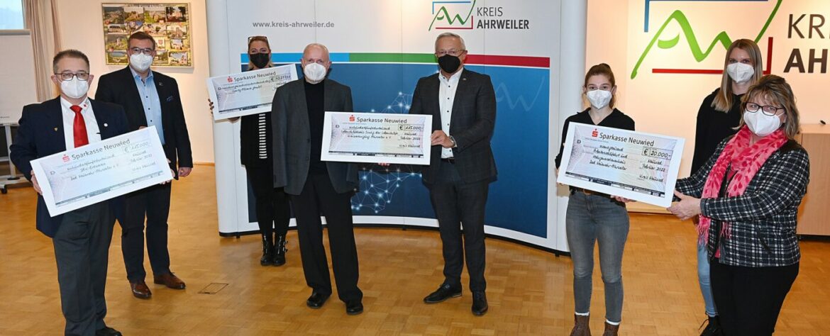 Kreis Neuwied | 6. Februar 2022 | (ww). Die Botschaft, die Landrat Achim Hallerbach mitbringt, ist einfach: „Wir vergessen Euch nicht!“, verspricht er. Und es sind keine hohlen Worte. Die Solidarität mit den Menschen an der Ahr kann er untermauern – mit vier symbolischen Schecks: Mehr als eine Viertelmillion Euro, genau 292.277,01 Euro, sind sie wert. Geld, das die Bürger aus dem Kreis Neuwied für ihre Nachbarn im Flutgebiet gespendet haben. Geld, das jetzt an vier Einrichtungen überwiesen wird, die damit den Menschen das Leben leichter machen. Ganz konkret vor Ort. Und natürlich 1:1, ohne einen Cent Abzug.
