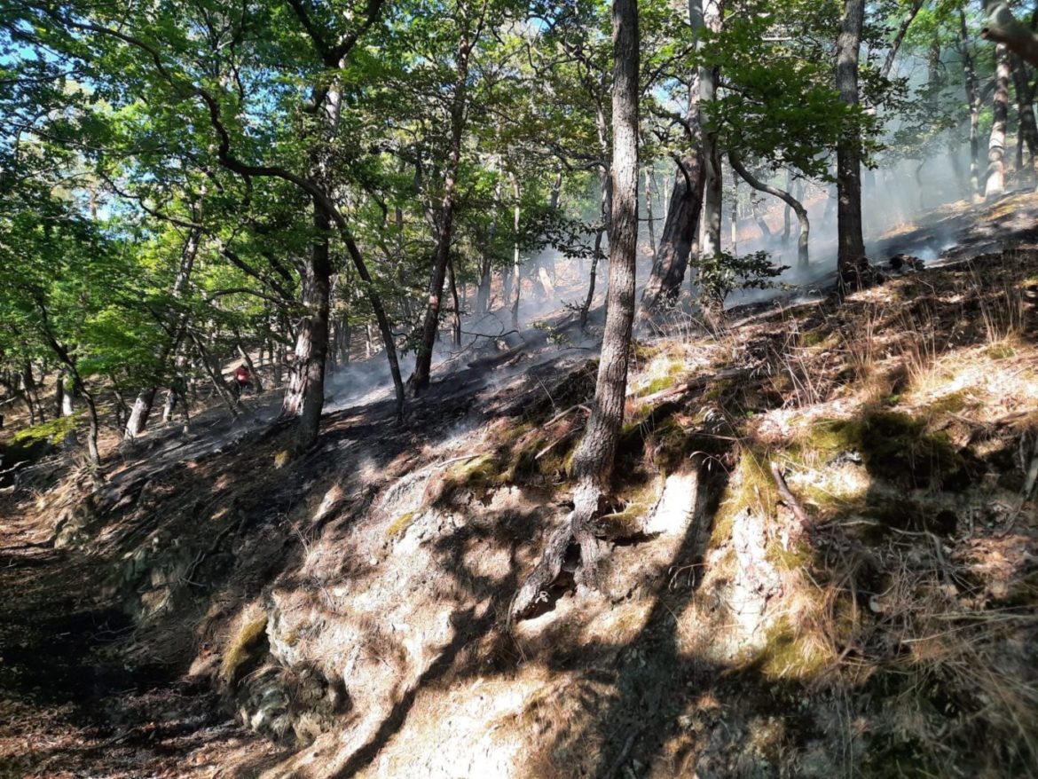 Braubach | 08. August 2022 | (cm). Nach dem Waldbrand bei Braubach hat die Feuerwehr jetzt ihren Abschlussbericht vorgelegt. Rund 400m² Wald im Bereich der drei Türme oberhalb der Dachsenhäuser Straße fielen den Flammen gestern zum Opfer. Der Brand war für die rund 60 Einsatzkräfte eine Herausforderung, denn im sehr unwegsamen Gelände konnte die Brandstelle zuerst nur zu Fuß erreicht werden. Zuvor hatte ein Hubschrauber der Polizei bei der Lokalisierung der Brandstelle geholfen. Selbiger unterstützte im Anschluss mit gezielten Wasserabwürfen die Löscharbeiten.