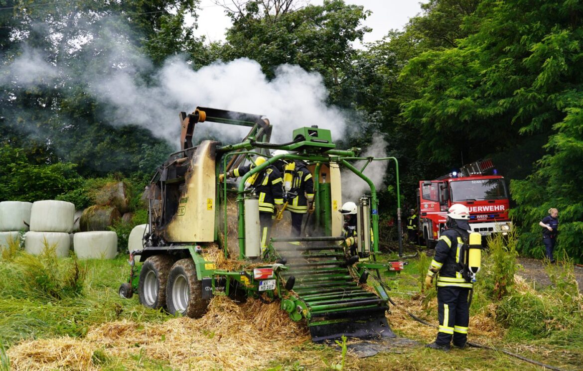Eitelborn / Denzerheide | 30. Juni 2024 | (ww). Zu einer brennenden Ballenpresse auf einem Feld auf der Denzerheide bei Eitelborn wurde die Freiwillige Feuerwehr Augst (ehemals Einheiten Neuhäusel und Eitelborn) heute Vormittag gegen 11.15 Uhr alarmiert. Wie sich schnell herausstellte, war das brennende landwirtschaftliche Gerät dasselbe, das gestern Abend auf der B260 bei Fachbach in Brand geraten war.