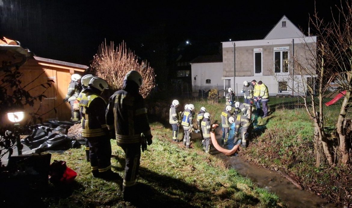 Arzbach | 2. Februar 2023 | (ww). Bereits zum zweiten Mal in dieser Woche wurden die Feuerwehren aus Arzbach und Bad Ems mit dem Stichwort „Öl auf Gewässer“ an den Emsbach (im Dialekt heißt es korrekt „an DIE Bach“, die Red.) nach Arzbach in den Wiesenweg alarmiert. Auch wenn die Anfahrt für die Arzbacher Wehr extrem kurz ist, das Gerätehaus dürfte nicht weiter als 50 Meter entfernt liegen, war vor allem der zweite Einsatz bei starkem Regen, niedrigen Temperaturen und rutschigen Verhältnissen am Bachufer sicher nicht besonders angenehm. Angefordert hatte das Umweltreferat der Kreisverwaltung Rhein-Lahn auch diesen erneuten Einsatz. Aus immer noch ungeklärter Ursache trat nach dem Einsatz am Dienstag auch am Donnerstagabend Öl aus dem schlammigen Uferbereich aus und gelangte in den Emsbach. Die Wehrleute entfernten das Öl und den ölhaltigen Schlamm. Dabei war Handarbeit angesagt. Als Ursache wird ein alter Tank im Uferbereich oder ein undichter Tank vermutet. Allerdings gibt es nich keinen Hinweis auf enen konkreten Verursacher. An und um die Einsatzstelle war deutlicher Ölgeruch wahrzunehmen.