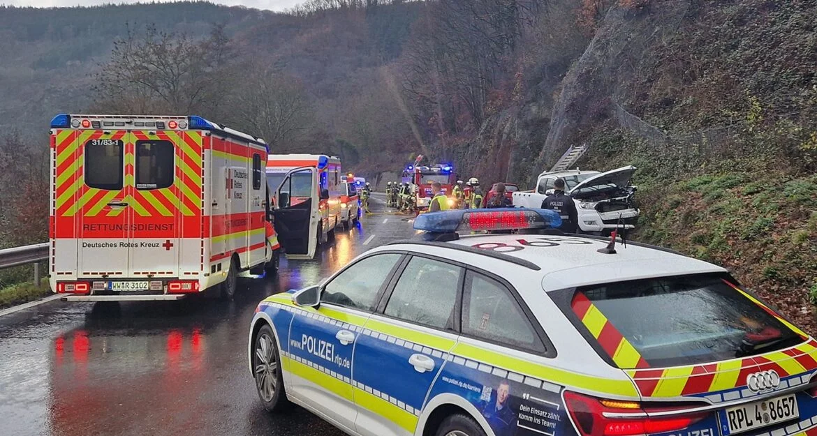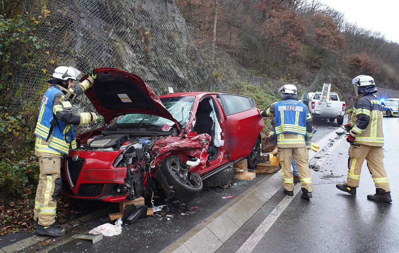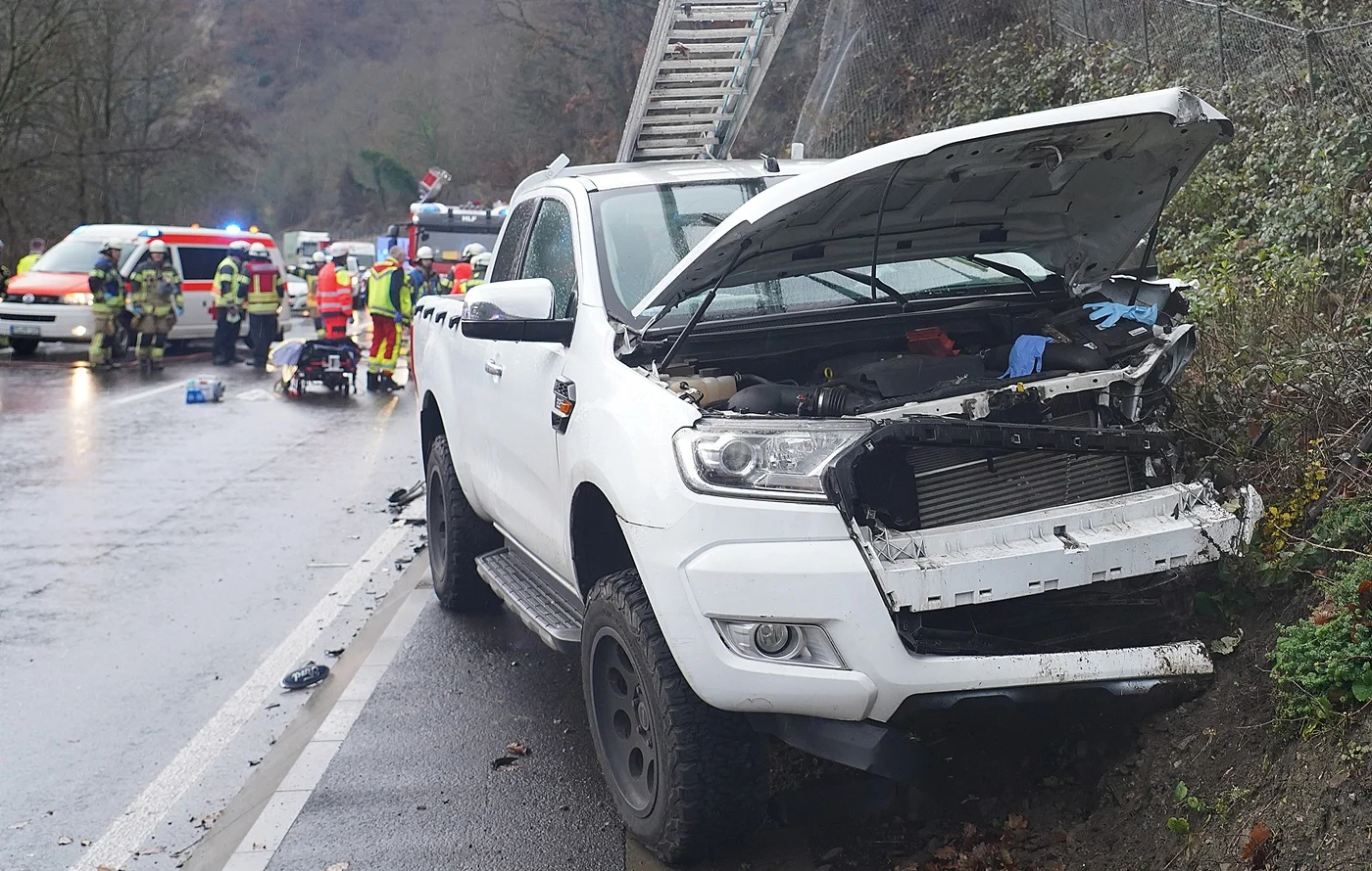 B260 / Lahnstein | 10. Dezember 2025 | (ww). Gegen 10 Uhr kam es heute Vormittag auf der B 260 bei Lahnstein zu einem Unfall, bei dem zwei Personen schwer verletzt wurden. Nach derzeitigem Stand befuhr der Unfallverursacher mit seinem Pickup die B 260 in Fahrtrichtung Bad Ems. Zwischen dem Parkplatz Ruppertsklamm und der Abfahrt nach Friedrichsegen, kam er aus bislang ungeklärten Gründen in einer leichten Rechtskurve nach links von seiner Fahrspur ab und kollidierte mit einem Fahrzeug im Gegenverkehr. Die Fahrerin des entgegenkommenden Autos wurde in ihrem Fahrzeug eingeklemmt und musste durch die Feuerwehr Lahnstein aus ihrem Fahrzeug befreit werden.