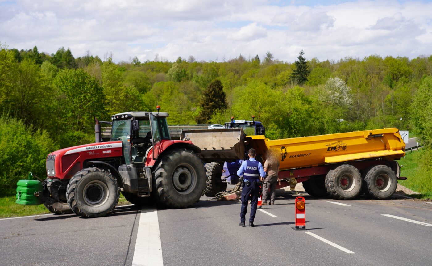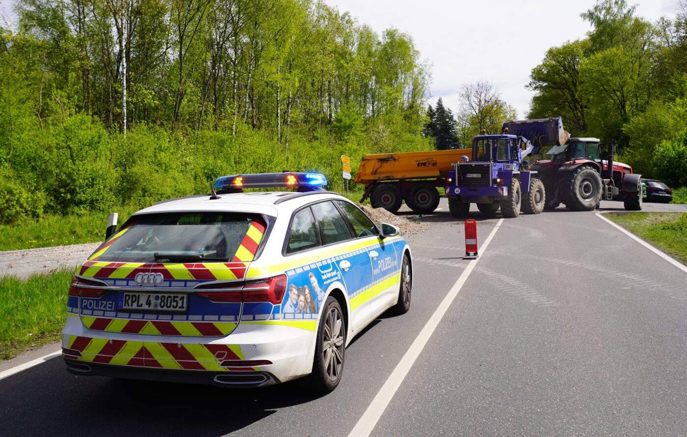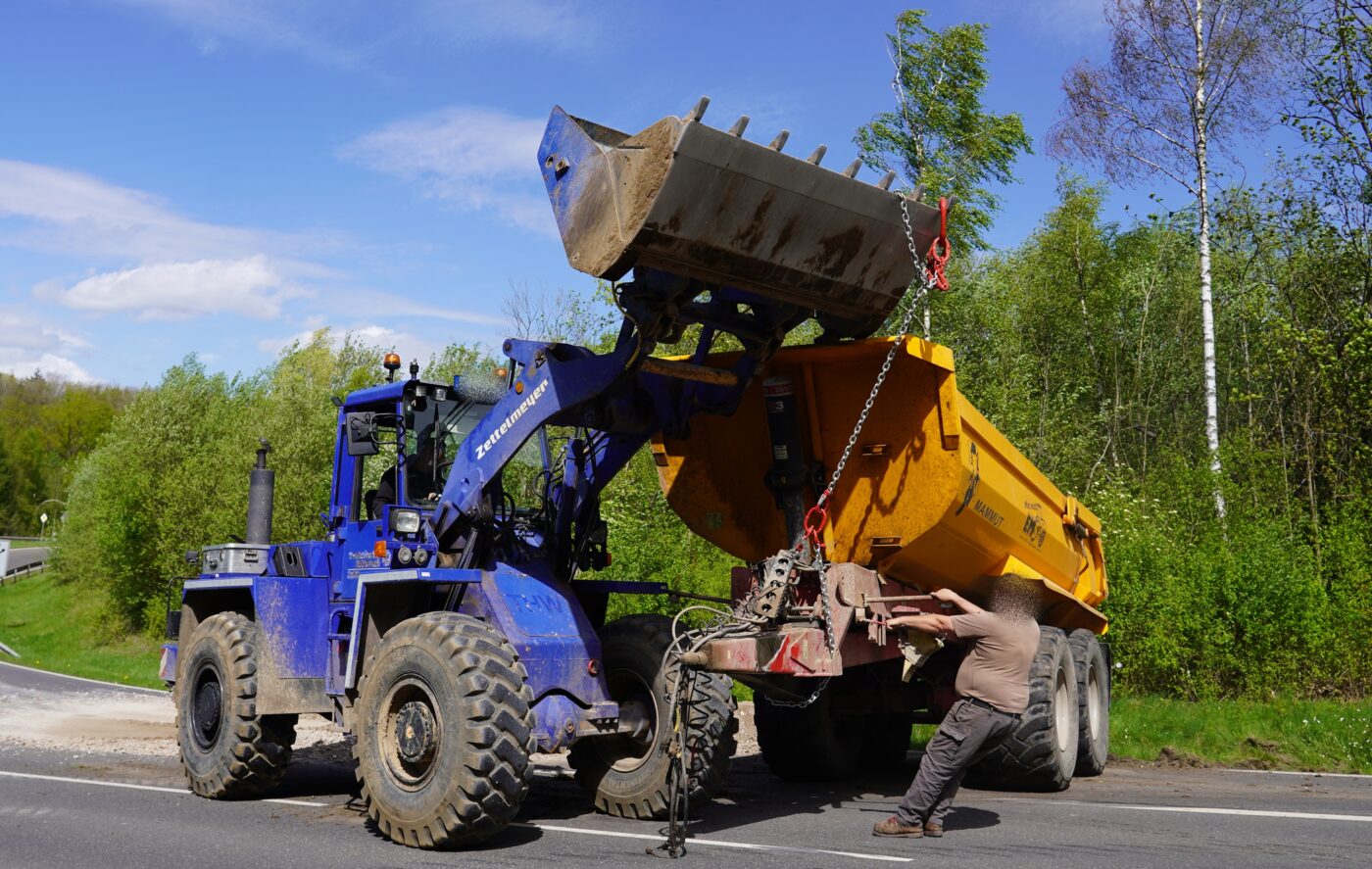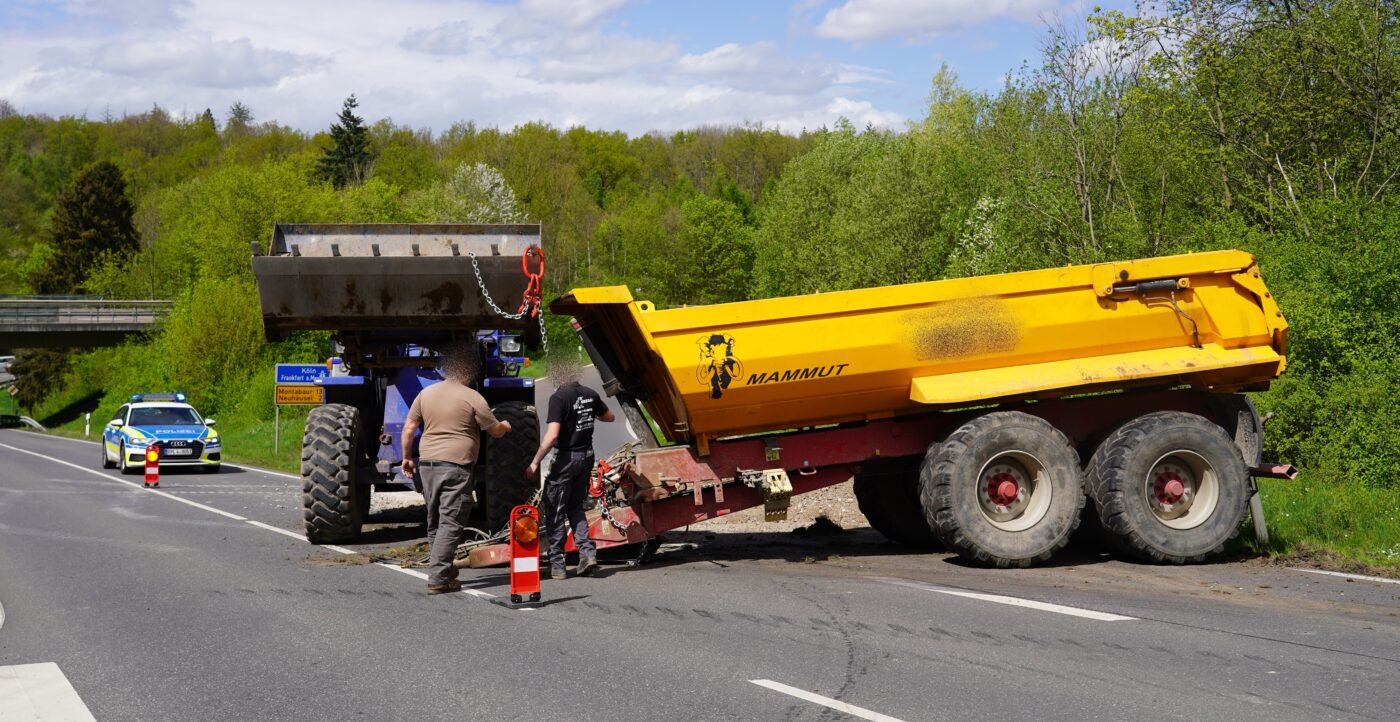 Nach Polizeiangaben vor Ort war ein Gespann aus einem mit Bauschutt-Recyclingmaterial beladenen Muldenkipper hinter einem Traktor bergab ins Schleudern geraten und schließlich in der Auffahrt umgekippt. Ladung und umgestürzter Muldenkipperanhäger blockierten die Auffahrt auf die B49 in Richtung Montabaur. Der Anhänger wurde mit einem privat beschafften Radlader wieder aufgerichtet, das Recyclingmaterial in einen mitgebrachten Container geschaufelt, die Fahrbahn anschließend gereinigt. Dafür musste die B261 kurz voll gesperrt werden, die Auffahrt auf die B49 in Richtung Montabaur war rnd 90 Minuten blockiert. Verletzt wurde bei dem Unfall niemand.