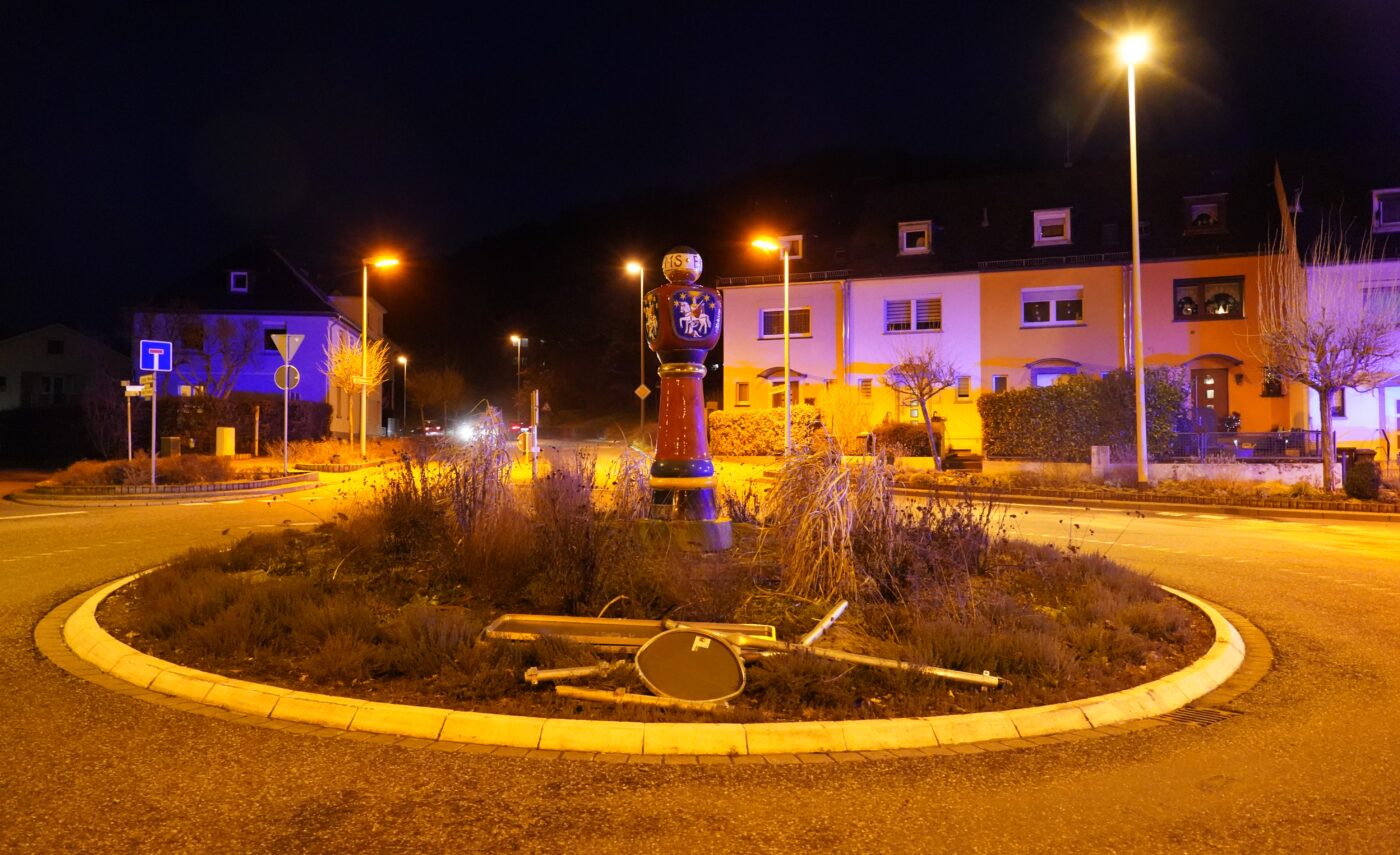 Bad Ems | 10. Februar 2024 | (ww). Gegen 17.20 Uhr kam es heute im Kreisel Marktstraße / Bleichstraße in Bad Ems zu einem Unfall, bei dem der Verursacher selbst verletzt wurde. Der alleinbeteiligte Fahrer fuhr zunächst über einen Fahrbahnteiler und „mähte“ die beiden installierten Schilder ab, anschließend fuhr er über den Kreisel und kam schließlich an einer Straßenlaterne zum Stehen. Er wurde hierdurch leicht verletzt, die Laterne sowie verschiedene Verkehrsschilder beschädigt. Bei ihm konnte deutlicher Atemalkoholgeruch festgestellt werden, der durchgeführte Alkoholtest ergab einen Wert von knapp 2 Promille . Im weiteren Verlauf der Ermittlungen konnte festgestellt werden, dass der Beschuldigte bereits wenige Minuten zuvor einen Verkehrsunfall auf dem Parkplatz des LIDL-Markts in Bad Ems verursacht hat und vom Unfallort geflüchtet war.