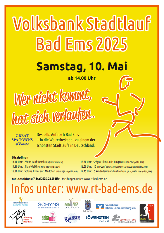Bad Ems | 14. April 2025 | (ww). Nur noch knapp drei Wochen, dann ist es wieder so weit. Dann verwandelt sich das historische Kurviertel von Bad Ems wieder in eine Laufsport-Arena. Bereits zum 17. Mal ist am 10. Mai wieder mitten im Welterbe-Bad der Volksbank-Stadtlauf angesagt. Das Laufsport-Event ist aus dem Bad Emser Veranstaltungskalender, aber auch aus der Stadtmitte lange schon nicht mehr wegzudenken. Kein Vergleich zum ehemaligen Streckenverlauf, der die Läufer über die Carl-Heyer-Promenade in die Wiesbach und zurück führte – weitestgehend unbeachtet von der Öffentlichkeit. Zum 17. Mal geht es entlang der historischen Bebauung durch die Römerstraße, am alten Rathaus vorbei, entlang der Lahn durch den Kurpark, vorbei an Häckers-Grand-Hotel und der Spielbank. Je nach Distanz wird die Runde mehrfach absolviert. „Das ist der vielleicht schönste Stadtlauf in Deutschland“, meint Stadtbürgermeister Oliver Krügel. „Das Streckenprofil ist bestzeitenfähig und in jedem Fall Garant für schnelle Zeiten“, betont der Stadtbürgermeister, der selbst auch schon einige Male mitgelaufen ist und zumindest persönliche Bestzeit erreichte.