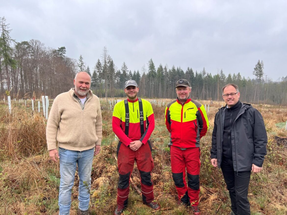 Bildunterzeile: Revierförster Martin Janner, Wettbewerbssieger Hannes Thon, Ausbilder Björn Sommer und Bürgermeister Jens Güllering (von links) freuen sich gemeinsam über den Erfolg beim diesjährigen Berufswettbewerb.