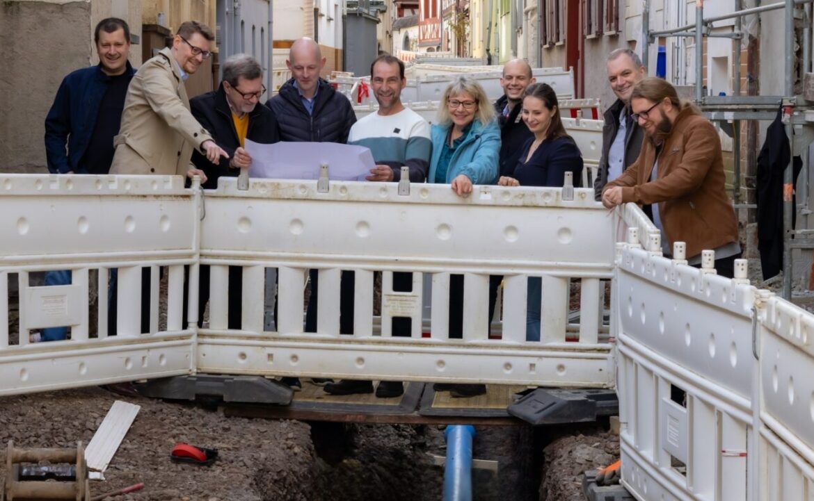 Björn Dennert, Markus Fischer, Stadtbeigeordneter Rolf Heep, Dennis Glowka, Günter Goß, Elke Singer, Marius Risch, Janine Goß, Lothar Lahnstein und Sven Relling (v. l. n. r.) besuchten die Baustelle in der Untermarktstraße.