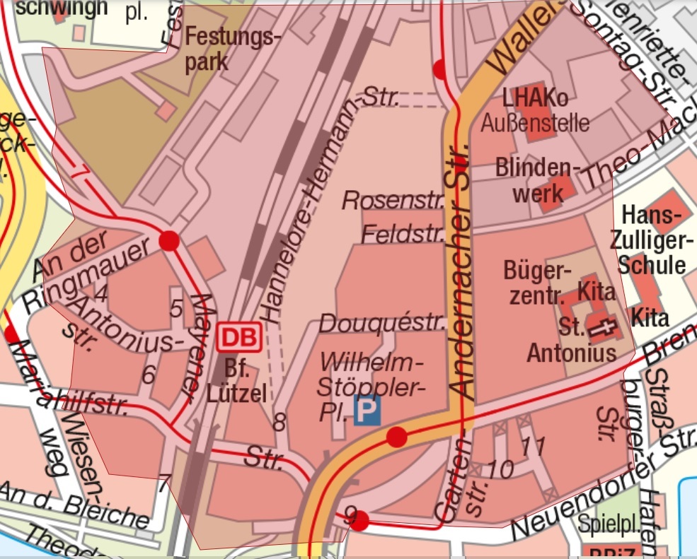 Koblenz-Lützel | 5. Juli 2022 | (ww). Die gestern bei Bauarbeiten gefundene amerikanische Fliegerbombe soll am kommenden Freitag, 08. Juli entschärft werden. Die 50 kg-Bombe bedingt einen Evakuierungsradius von 300 m, die betroffenen Straßen ergeben sich aus der beigefügten Karte. Die dort lebenden rund 4.500 Menschen müssen das Gebiet bis 17.30 Uhr verlassen haben. Sie werden mit Handzetteln, die morgen verteilt werden, und am Freitag mit Lautsprecherwagen auf die Evakuierung hingewiesen.