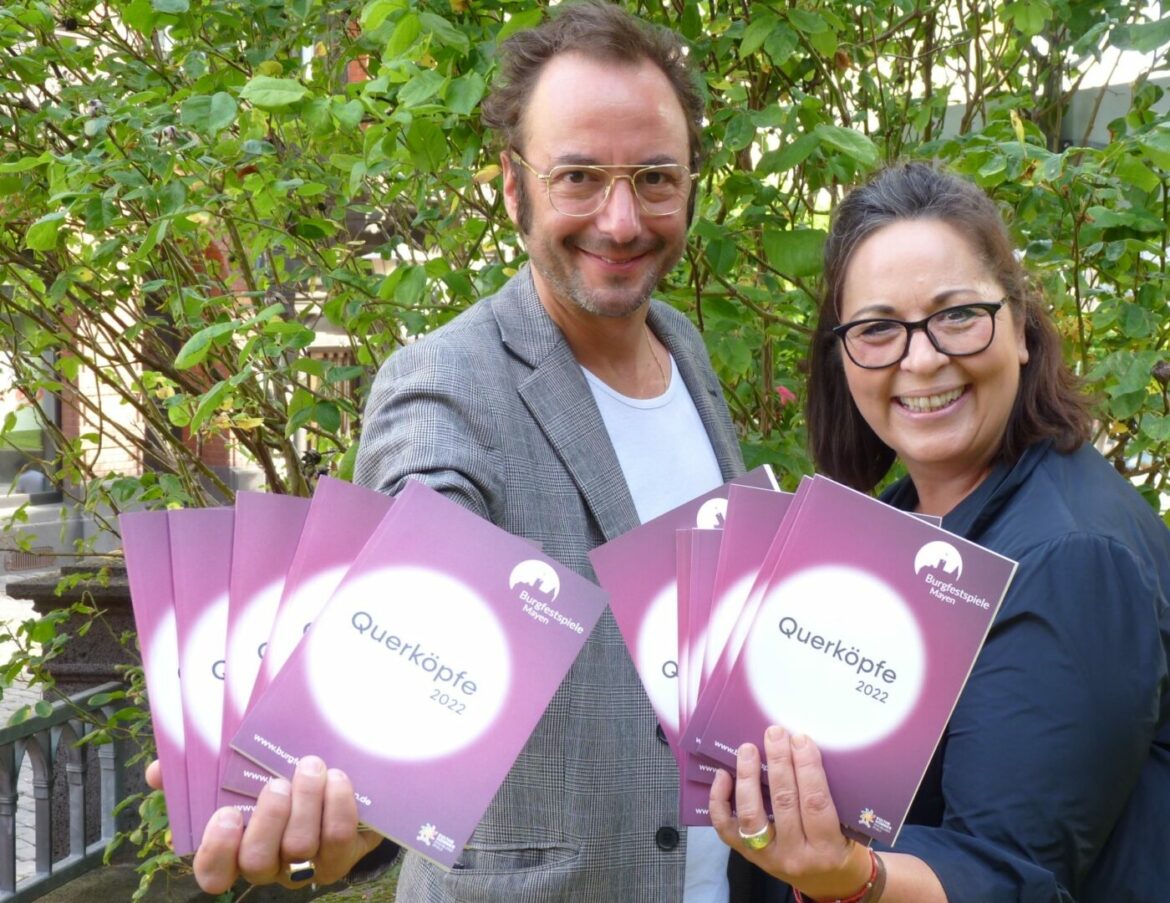 Mayen | 25. Mai 2022 | (cm). Auf 80 Seiten durch die Spielzeit: ab sofort liegt ein Spielzeitheft der Burgfestspiele Mayen in den Geschäften, in der Touristinfo, der Stadtverwaltung und an anderen Stellen in der ganzen Stadt aus. Das Heft ist kostenlos und darf gerne mitgenommen werden! Das teilte die Stadt jetzt mit. Intendant Alexander May und die Stellvertretende Intendantin Petra Schumacher freuen sich, dass zum ersten Mal in der Historie der Festspiele ein Spielzeitheft aufgelegt wird. Im Spielzeitheft können alle Interessierte das Team kennenlernen: Schauspieler, Regisseure, das Leitungsteam, Musiker und viele mehr. Außerdem gibt es Informationen zu allen Veranstaltungen und Hintergrundinfos zu Spielzeitmotto und Produktionen. Unter dem Motto „Querköpfe“ startet die Festspielsaison vor, auf und hinter der Bühne in den Theatersommer 2022.