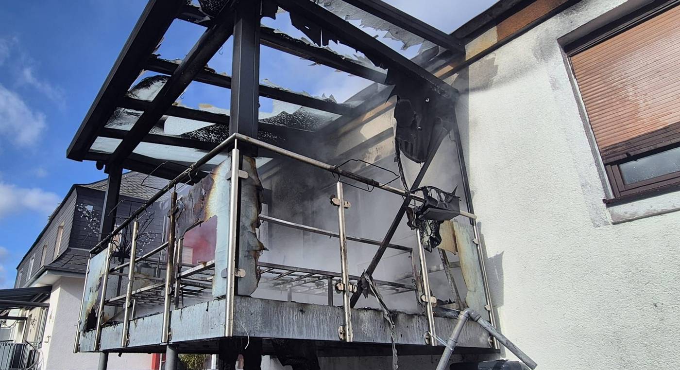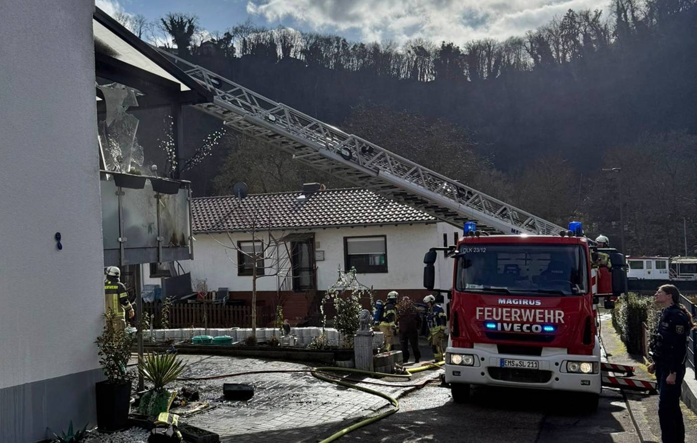Lahnstein | 18. Februar 2026 | (ww). Gegen 12 Uhr wurde die Freiwillige Feuerwehr Lahnstein zu einem Brand in der Emser Landstraße alarmiert. Beim Eintreffen der ersten Kräfte stand ein an ein Wohnhaus angebauter großer Balkon in Vollbrand. Das Feuer drohte aufgrund der zu diesem Zeitpunkt gerade platzenden Scheiben auf die Innenräume überzugreifen, die Flammen schlugen bereits über das Dach.