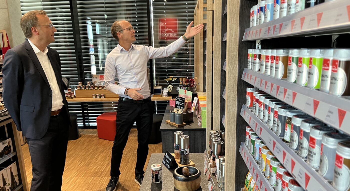 Im Gewürzshop staunt Josef Oster über die Vielfalt der exotischen Zutaten, von denen viele noch nie in seinen Töpfen schmorten. Tonka Bohne. Kampot Pfeffer. Rosa Steinsalz. Er zieht die Augenbrauen hoch. Wofür benutzt man das? Natürlich will der Abgeordnete auch wissen, wie sich die Corona-Pandemie oder der Ukraine-Krieg auf das Unternehmen ausgewirkt haben. „Die Pandemie hat sicher mehr Menschen an den eigenen Herd gebracht und müsste das Geschäft ja eher angekurbelt haben“, so Oster. Das bestätigt Andreas Hartkorn, auch wenn Corona mit anderen Schwierigkeiten aufwartete. Was den Betrieb allerdings massiv belaste, sei der Ukraine-Krieg. „Und das nicht nur, weil die Ukraine ein Hauptanbauland für Senfsaat ist“, sagt Hartkorn. Der Krieg habe viel weitreichendere Effekte. Letzteres hat auch die Berliner Politik. Neben entschieden zu viel Bürokratie und starrer Vorschriften ohne Ermessensspielräume bereitet dem Gewürzexperten gerade ein ganz spezielles Thema Kopfzerbrechen. Es handelt sich um eine Gesetzesnovelle, die unter anderem ein Retourenverbot beinhaltet. „Das Gesetz zu unfairen Handelspraktiken soll kleine Händler schützen, was gut und richtig ist“, so Hartkorn. Für mittelständische Unternehmen wie seines aber bedeute das Gesetz einen erheblichen Wettbewerbsnachteil gegenüber großen Betrieben. Josef Oster packte das Thema gern in seine Aktentasche, die sich während seiner Sommertour erfahrungsgemäß mit Anregungen und Anliegen aus dem Wahlkreis schnell füllt. „Genau das ist der Grund, warum ich den Austausch mit den Menschen vor Ort suche“, betont der Abgeordnete. „Ich will wissen, was die Berliner Politik in der Fläche aus- und manchmal auch anrichtet.“ Anrichten wird Oster jedenfalls seine Mahlzeiten künftig auf neue Art: mit viel Inspiration aus der Hartkorn Gewürzmühle.