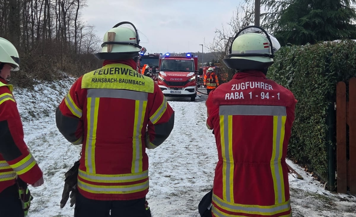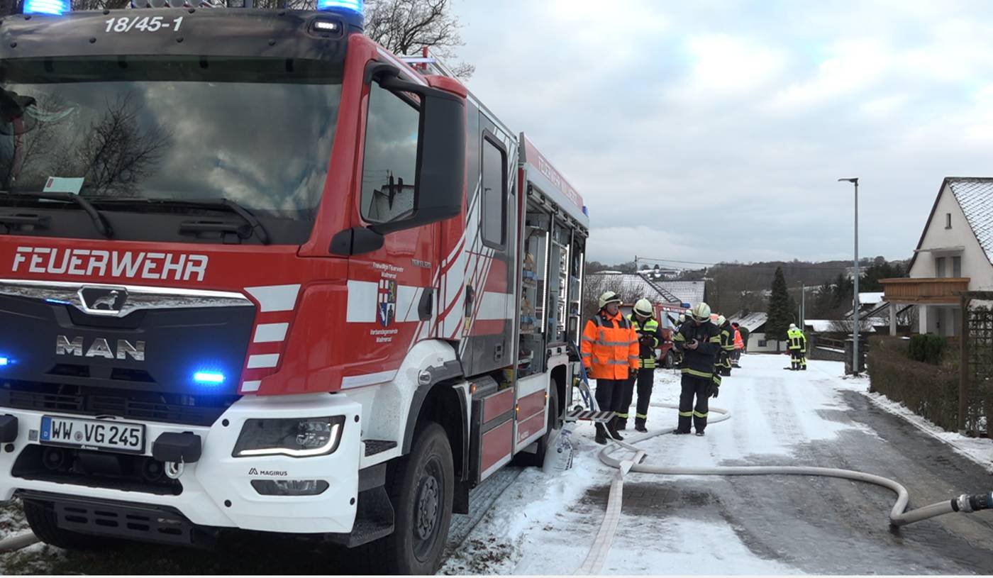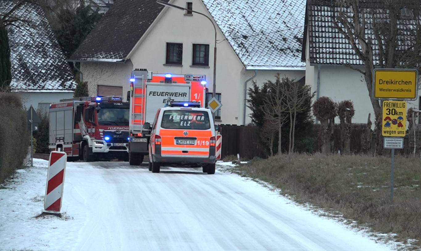 Dreikirchen | 3. Januar 2026 | (ww). In der Ringstraße in Dreikirchen (Verbandsgemeinde Wallmerod / Westerwald) kam es heute gegen 9.30 Uhr zum Vollbrand eines Einfamilienhauses in Holzbauweise. Mehrere Feuerwehreinheiten sowie Rettungs- und Polizeikräfte steuerten bei winterlichen Straßenverhältnissen die Einsatzstelle an. Mitlerweile (11.45 Uhr) ist das Feuer unter Kontrolle, es müssen aber noch aufwändige Nachlöscharbeiten erfolgen. Das Haus ist schwer beschädigt. Zur Ursache, Schadenshöhe und über möglicherweise Verletzte gibt es noch keine Informationen. Es wird nachberichtet.