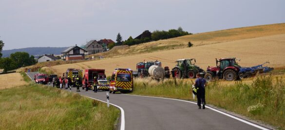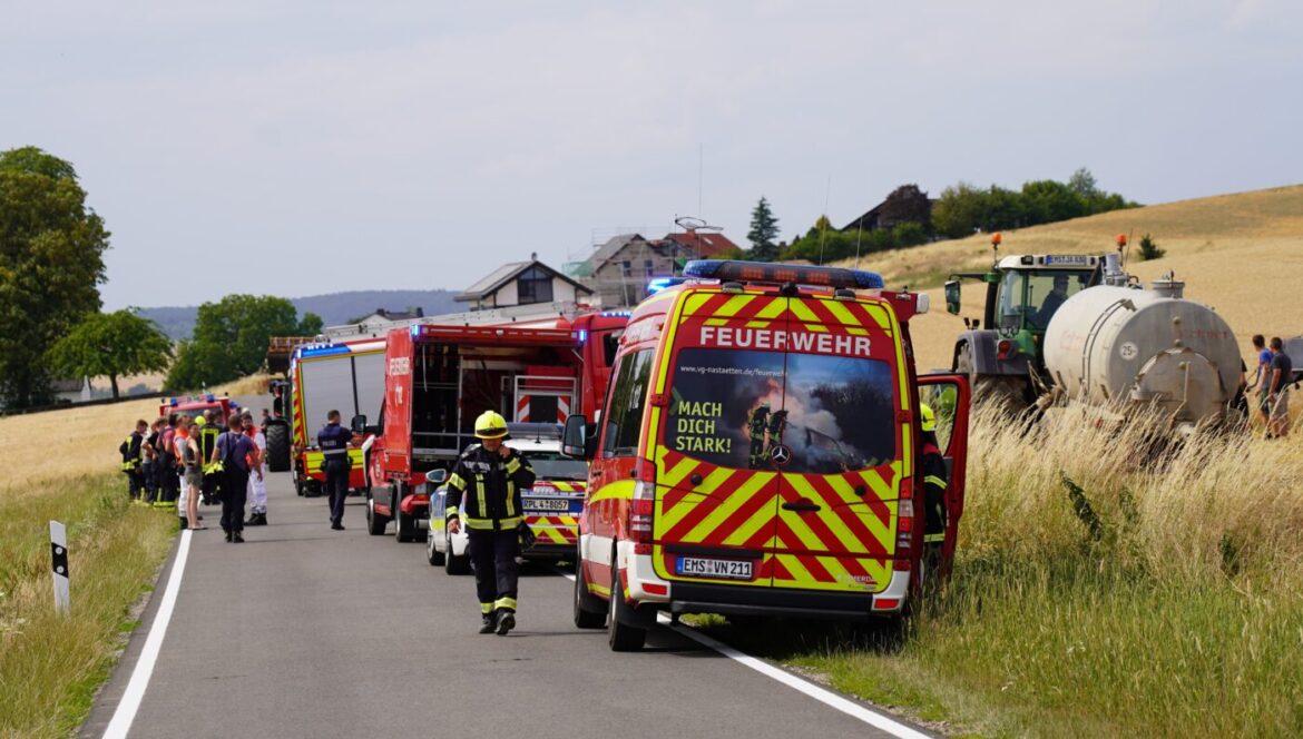 Bogel | 9. Juli 2023 | (ww). Der Sonntagnachmittag hat Feuerwehren, Polizei, den Rettungsdienst aber auch 56aktuell in Atem gehalten. Noch auf dem Rückweg vom Flächenbrand in Prath erreichte uns die Nachricht über einen weiteren Flächenbrand – diesmal in der Verbandsgemeinde Nastätten. Bei Bogel war eine weiterer Ackerbrand gemeldet. Bei Mäharbeiten und vermutlich dadurch verursachten Funkenflug am Mähdrescher kam es zu dem Brand an der B274 zwischen Bogel und Nastätten. Auch das Feuer bei Bogel konnte durch ein tolles Zusammenspiel von Landwirten und Feuerwehr schnell unter Kontrolle gebracht und gelöscht werden. Betroffen war eine Fläche von ca. einem Hektar.