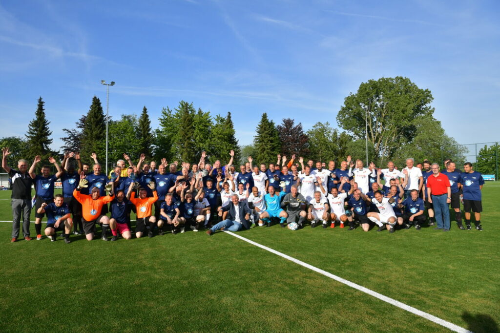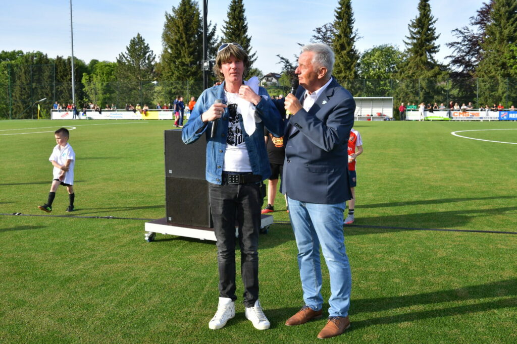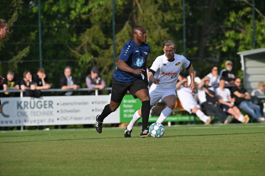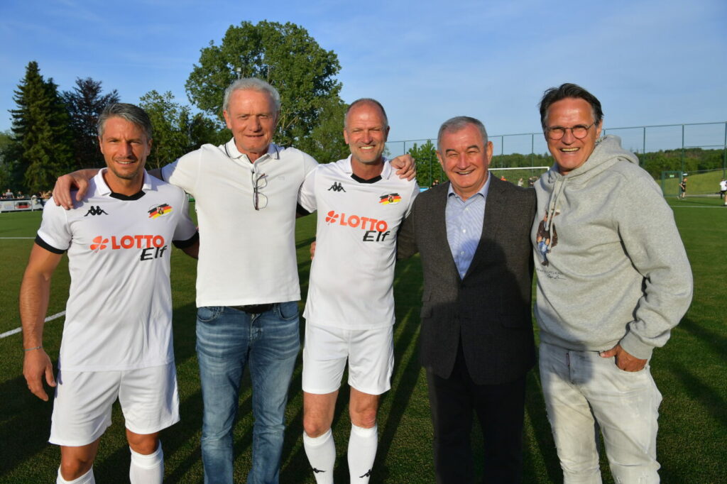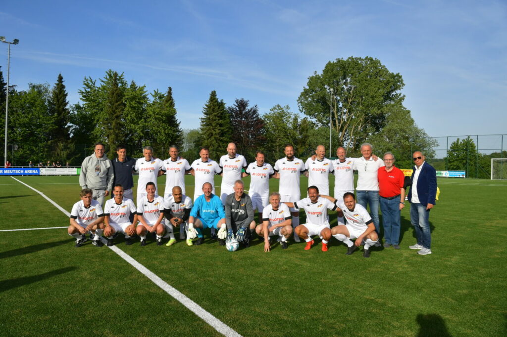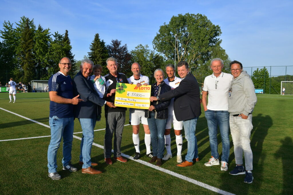 Kroppach | 14. Mai 2022 | (ww). Als die Spendensumme des Benefizspiels der Lotto-Elf gegen eine Ü40-Auswahl des FSV Kroppach bekanntgegeben wurde, ging mehr als ein Raunen durch die Reihen der rund 500 Zuschauer. Der Westerwaldort Kroppach hatte mit 57.000 Euro Geschichte geschrieben, denn noch nie hatte die von Fußball-Europameister Hans-Peter Briegel gecoachte Prominentenmannschaft von Lotto Rheinland-Pfalz eine solch hohe Spendensumme in einer Partie eingespielt. Dass beim 18:2 (8:0)-Sieg der Lotto-Elf auch noch 20 Tore zu sehen waren, krönte den Auftritt in der Reiner-Meutsch-Arena. Damit wäre auch der Impulsgeber dieses Spiels genannt. Reiner Meutsch hat mit seiner Fly & Help-Stiftung weltweit Bildungsprojekte auf den Weg gebracht. „Mit der eingespielten Spendensumme können wir im kommenden Jahr eine weitere Schule im rheinland-pfälzischen Partnerland Ruanda bauen“, frohlockte Meutsch, der sich von der Spendenbereitschaft überwältigt zeigte. „Kinder haben Geld aus ihrer Spardose gespendet“, war der Stiftungsgeber regelrecht angefasst.