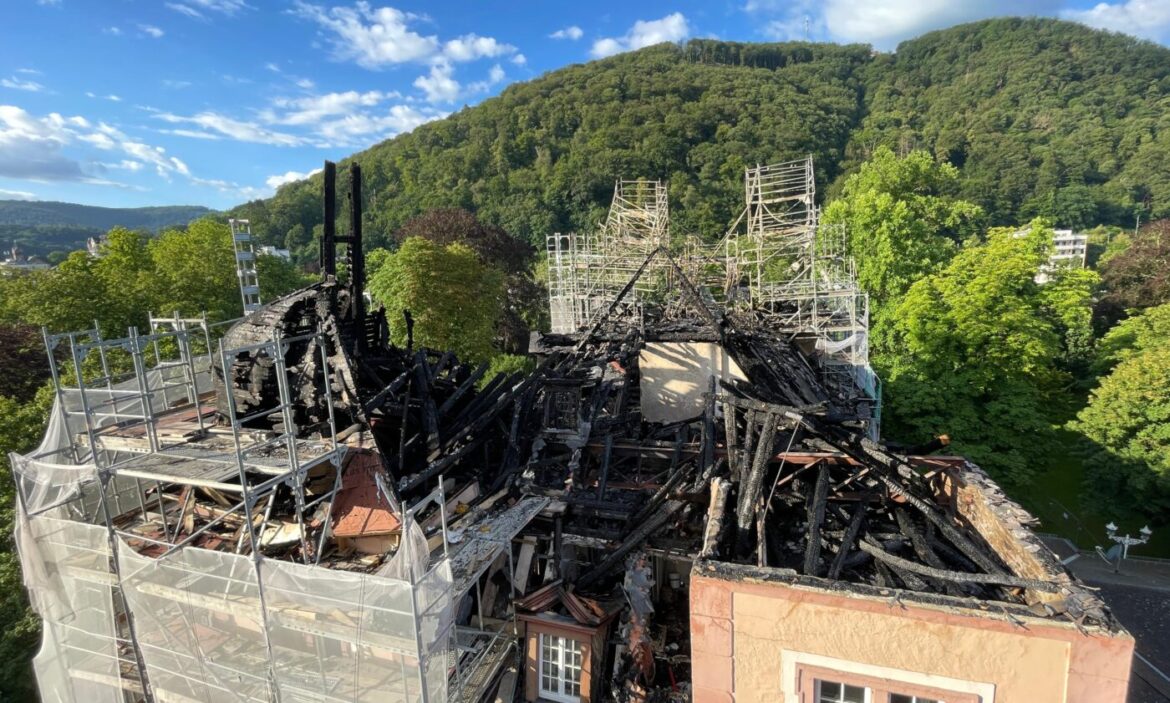 Bad Ems | 8. Juli 2024 | (ww). Auch fünf Tage nach dem verheerenden Feuer im historischen Vier-Türme-Haus (ehemals Karlsburg) in Bad Ems gibt es im zusammengestürzten Dachstuhl immernoch Glutnester und wiederaufflammende Feuerstellen. Heute Früh, kurz nach 6.30 Uhr, wurde die Freiwillige Feuerwehr Bad Ems wieder zur Einsatzstelle des Großbrands vom vergangenen Mittwoch alarmiert. Rauch stieg aus dem zusammengestürzten Dachstuhl auf.