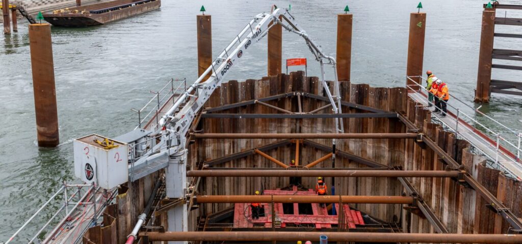 Koblenz | 14. Februar 2025 | (ww). Am vergangenen Dienstag und Mittwoch wurde auf der Baustelle der Pfaffendorfer Brücke zum ersten Mal in einem so genannten Spundwandkasten im Rhein betoniert. An beiden Tagen wurden zusammen rund 1.000 Kubikmeter Beton mit 120 Betonmischfahrzeugen angeliefert und für die Erstellung des ersten Fundamentes für die Brücke in Seitenlage verarbeitet.