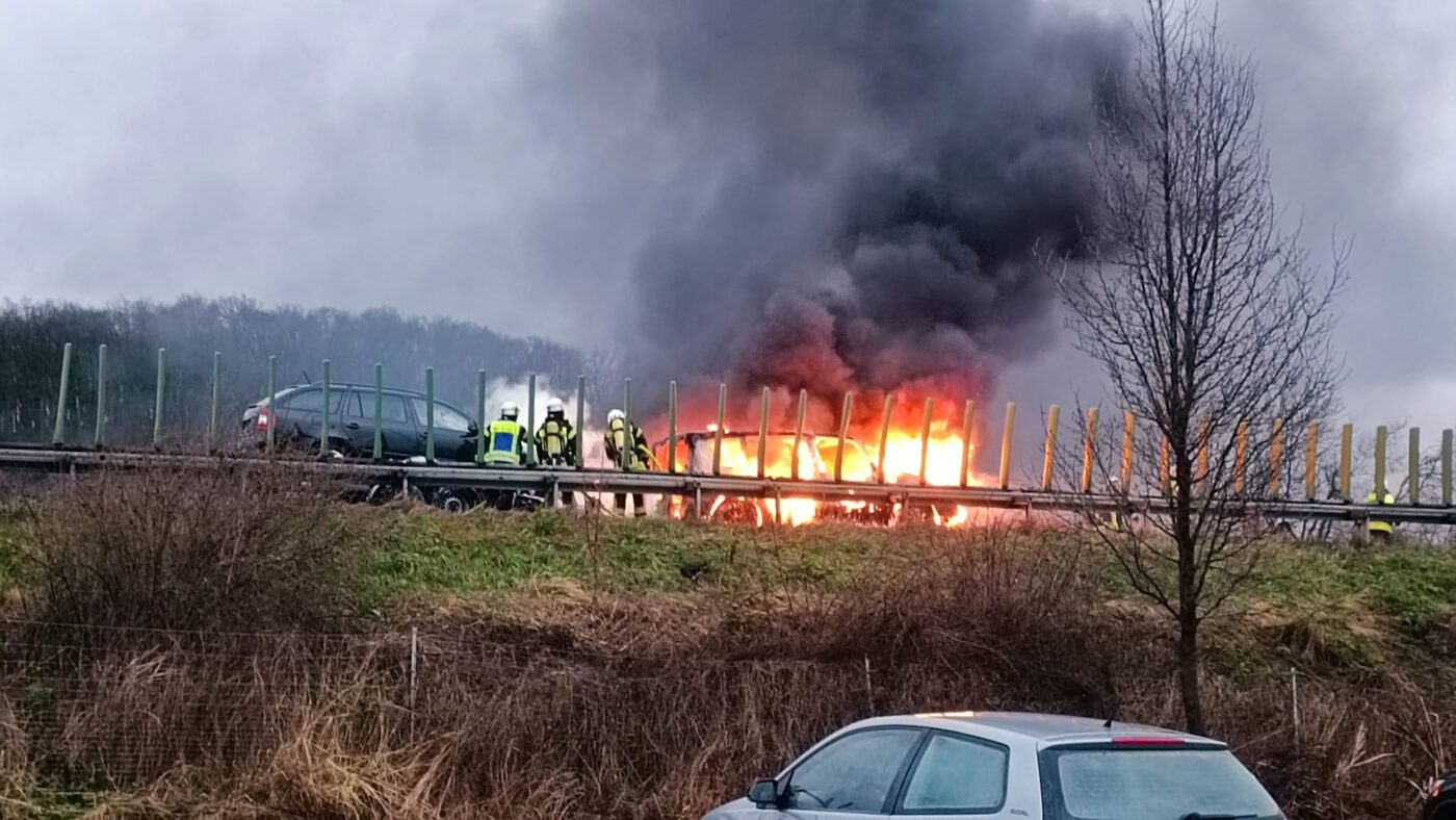 Montabaur | 2. Januar 2023 | (ww). Gegen 16.10 Uhr kam es auf der A3 bei Montabaur, Höhe ICE Bahnhof, zu einem Fahrzeugbrand mit extremer Rauchentwicklung. Die A3 war zeitweise in beide Fahrtrichtungen gesperrt, der Einsatz dauerte gegen 17.10 Uhr noch an. Bislang gibt es wenig Informationen, bekannt ist dass ein Fahrzeug, dass auf einem Anhänger ein weiteres Auto transportierte im Vollbrand stand. Auch das Fahrzeug auf dem Anhänger und der Anhänger selbst gerieten in Brand, allerdings konnte die Feuerwehr da ein komplettes Ausbrennen verhindern. Augenzeugen berichten, die Feuerwehr sei teilweise auch entgegen der Fahrtrichtung auf der Autobahn zur Einsatzstelle angefahren um das Feuer zu bekämpfen. Es kam zu einer extrem starken Rauchentwicklung, zeitweise waren beide Fahrspuren gesperrt, es kam zu massiven Rückstaus.