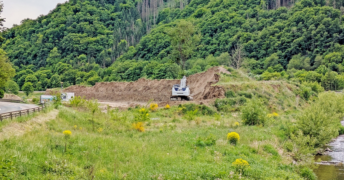 Der Campingplatz in der Ahrschleife war einst ein beliebter Ort für Erholung, wurde jedoch durch die Flutkatastrophe am 14. Juli 2021 zerstört. Eine Neugestaltung ist nicht geplant. Der Fokus liegt nun auf dem Schutz bei künftigen Extremwetterlagen. Rund 800 Kubikmeter Material verlassen täglich das Gelände, was etwa 60 Lkw-Fahrten pro Tag entspricht. Die Entsorgung erfolgt je nach festgestellter Schadstoffklasse auf spezialisierten Deponien in der Region, etwa in Alfter und Mendig. Für einen sicheren Ablauf sorgt die Remagener Firma Wahl im Auftrag der Ortsgemeinde: Ein eigens asphaltierter südlicher Zugang dient als Ein- und Ausfahrt, eine Reifenwaschanlage sowie Reinigungsfahrzeuge halten die B 257 und ihre Umgebung sauber und verkehrssicher. Bereits im Herbst 2024 wurden erste vorbereitende Maßnahmen umgesetzt. Dazu gehörten das Entfernen invasiver Pflanzen wie Robinien und japanischem Staudenknöterich sowie der Einsatz von Flatterband auf Tonkinstäben, um Brutplätze geschützter Vogelarten auf angrenzenden Flächen zu schützen. Inzwischen ist mehr als die Hälfte der Fläche beräumt – ein beachtlicher Zwischenschritt auf dem Weg zu mehr Sicherheit für die Ortsgemeinde und den gesamten Ahrverlauf.