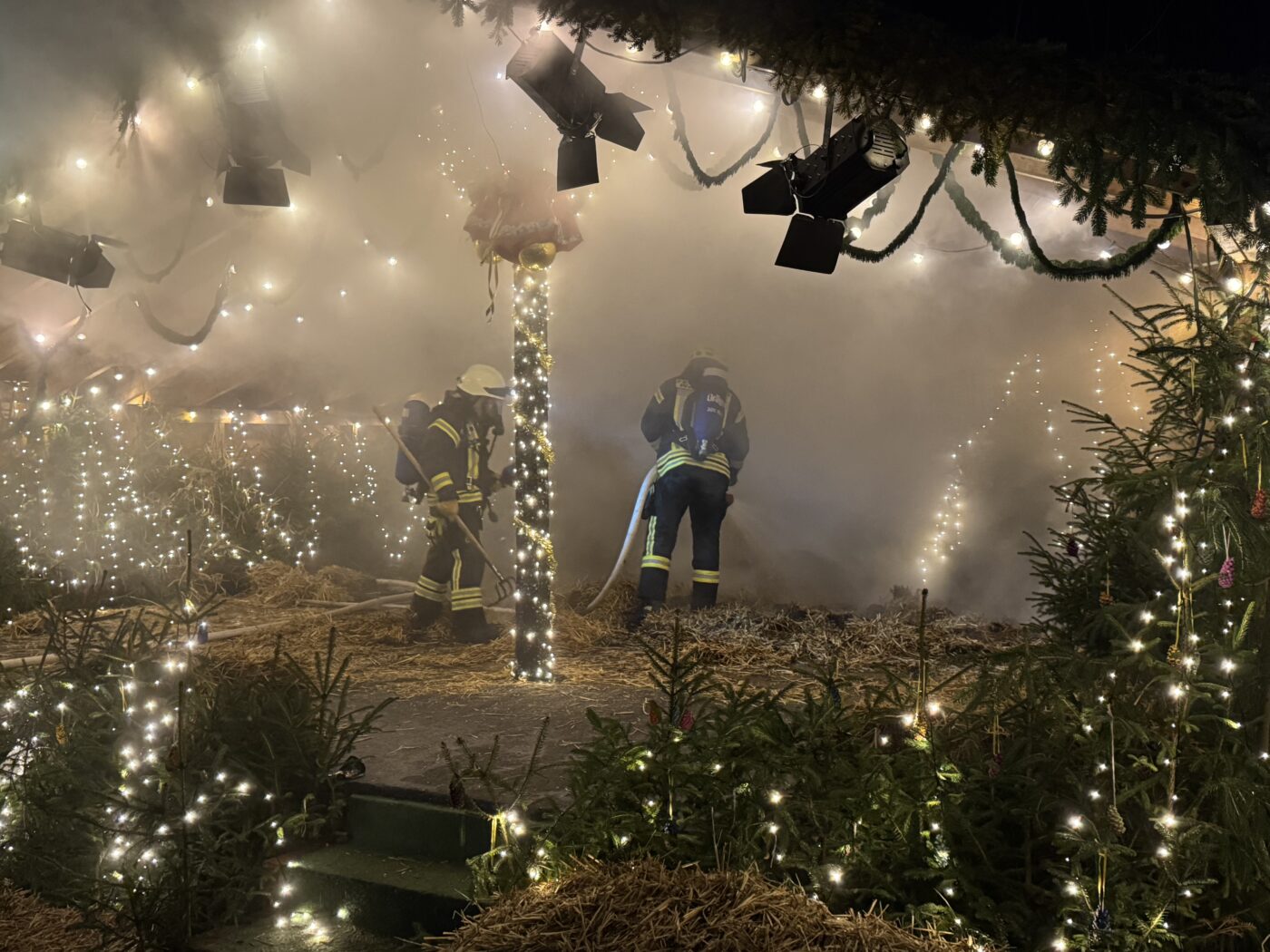 Westerburg | 5. Dezember 2025 | (ww). Heute gegen 18 Uhr wurden die Feuerwehren aus Westerburg, Wengenroth und Gershasen zu einem Bühnenbrand auf das Gelände des Pfefferkuchen-Weihnachtsmarktes in Westerburg alarmiert. Beim Eintreffen der ersten Einsatzkräfte brannte das auf dem Bühnenboden aufgebrachte Stroh. Umgehend wurde ein Angriffstrupp mit einem Strahlrohr zur Brandbekämpfung eingesetzt. Im weiteren Einsatzverlauf wurde das Stroh durch die Feuerwehr auseinandergezogen und mit einem Wasser-Schaum Gemisch abgelöscht. Mit Hilfe einer Wärmebildkamera wurde der Bühnenaufbau, sowie alle weiteren noch aufgebauten Verkaufshütten auf Hitzeentwicklungen, zum Beispiel durch Glutnester kontrolliert – dabei wurde nichts Relevantes mehr entdeckt. Durch das Feuer wurde der Bühnenboden, die Rückwand und die Überdachung der Bühne beschädigt. Glücklicherweise war der Pfefferkuchenmarkt nicht mehr geöffnet, sodass sich keine Besucher auf dem Gelände aufhielten. Verletzt wurde niemand. Die Polizei hat die Ermittlungen zur Brandursache aufgenommen.