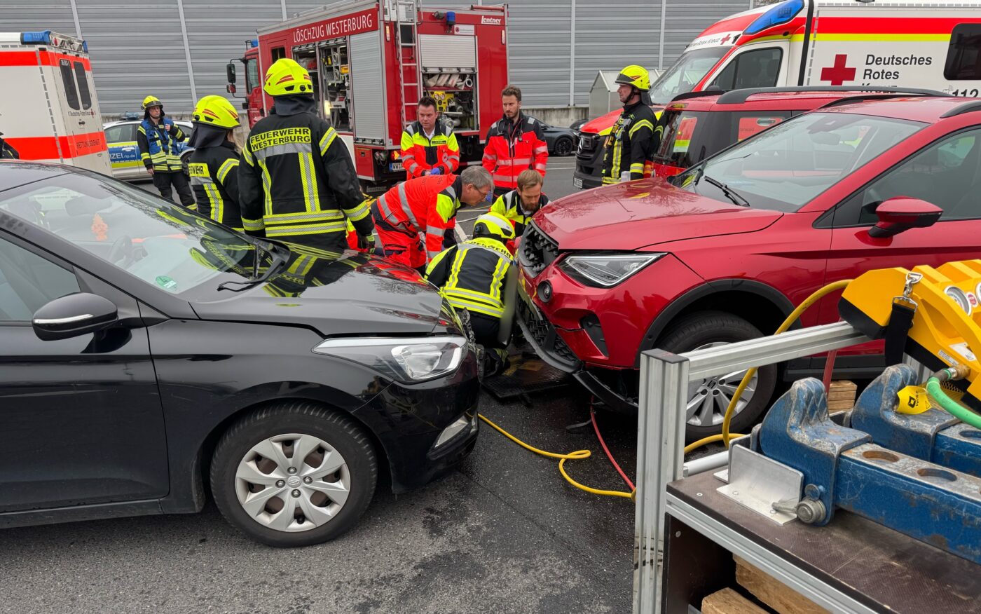 Westerburg | 7. November 2025 | (ww). Heute Mittag gegen 12.30 Uhr wurden die Feuerwehren Westerburg und Gershasen zu einem Einsatz auf dem Parkplatz eines Supermarktes in Westerburg alarmiert. Die Einsatzmeldung lautete „Person in Zwangslage“. Vor Ort stellten die Einsatzkräfte fest, dass zwei Autos frontal kollidiert waren und eine Person unter einem der Fahrzeuge eingeklemmt war. Ersthelfer versorgten die betroffene Person, bevor der Rettungsdienst die medizinische Behandlung übernahm. Nach gemeinsamer Abstimmung mit dem Rettungsdienst wurde die technische Rettung mittels Hebekissen vorbereitet. Aufgrund der Verletzungen der betroffenen Frau wurde ein Rettungshubschrauber nachalarmiert. Nachdem die Frau aus ihrer Zwangslage befreit wurde, konnte sie dem Rettungsdienst übergeben werden. Da der hinzualarmierte Rettungshubschrauber wetterbedingt nicht direkt am Einsatzort landen konnte, wählte der Pilot eine Wiese am Friedhof in Rotenhain als Landeplatz. Um den schnellen Transfer der Hubschrauberbesatzung zu gewährleisten, brachte die Feuerwehr Westerburg diese mit einem Einsatzfahrzeug zur Unfallstelle. Die schwerverletzte Frau wurde anschließend per Hubschrauber in eine Klinik geflogen. Eine weitere, mittelschwer verletzte Person wurde mit dem Rettungswagen in ein Krankenhaus gebracht.