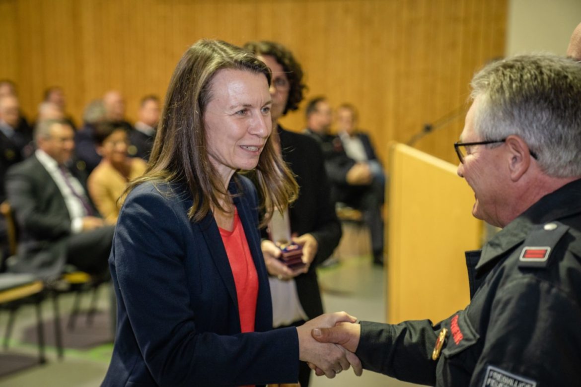 Waldorf/Ahrweiler | 20. November 2022 | (ms). Für ihr persönliches Engagement und den langjährigen Dienst an der Allgemeinheit sind in der vergangenen Woche insgesamt 93 Mitglieder der Freiwilligen Feuerwehren im Kreis Ahrweiler durch Landrätin Cornelia Weigand ausgezeichnet worden. Für ihre 35-jährige beziehungsweise 45-jährige Mitgliedschaft erhielten sie das Goldene Feuerwehr-Ehrenzeichen des Landes Rheinland-Pfalz. Bei der feierlichen Veranstaltung in der Vinxtbachhalle in Waldorf hob die Landrätin bereits zur Eröffnung die Wichtigkeit des besonderen persönlichen Engagements für die Sicherheit der Bevölkerung im Kreis Ahrweiler hervor. So würden die Kameraden unter dem Einsatz ihres Leibes und Lebens retten, löschen, bergen und schützen – dies sei ein unbezahlbarer Dienst an der Gesellschaft, so Weigand. Auch in der Nacht der verheerenden Flutkatastrophe und in den Tagen und Wochen danach seien die Frauen und Männer der Feuerwehren rund um die Uhr bis zur Erschöpfung und weit darüber hinaus im Einsatz gewesen. Und dies, obwohl viele von ihnen selbst betroffen gewesen seien. Eine besondere Auszeichnung erhielt Karl Oelsberg aus Burgbrohl für seine hervorragenden Verdienste um das Feuerwehrwesen und seinen außerordentlichen persönlichen Einsatz. Er wurde mit dem Goldenen Feuerwehr-Ehrenzeichen am Bande bedacht. Darüber hinaus nahm die Landrätin einige Ent- und Verpflichtungen in der Führung des Gefahrstoffzuges vor. Nachfolgend die Feuerwehrmitglieder, die in den jeweiligen Wehren ausgezeichnet wurden: