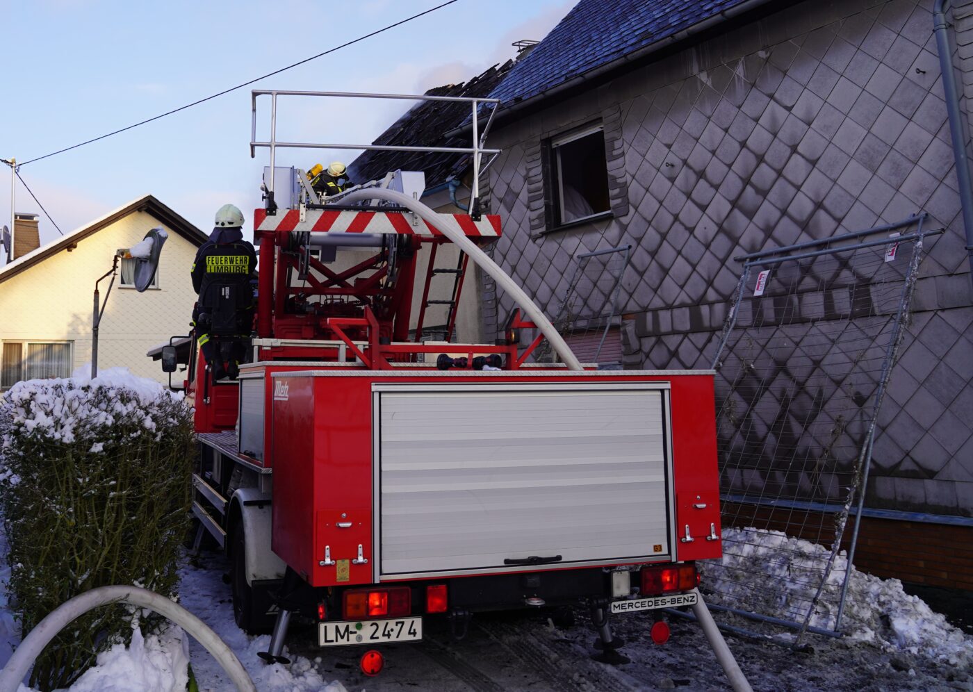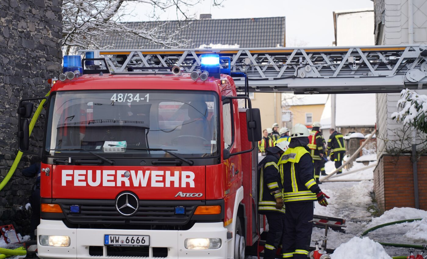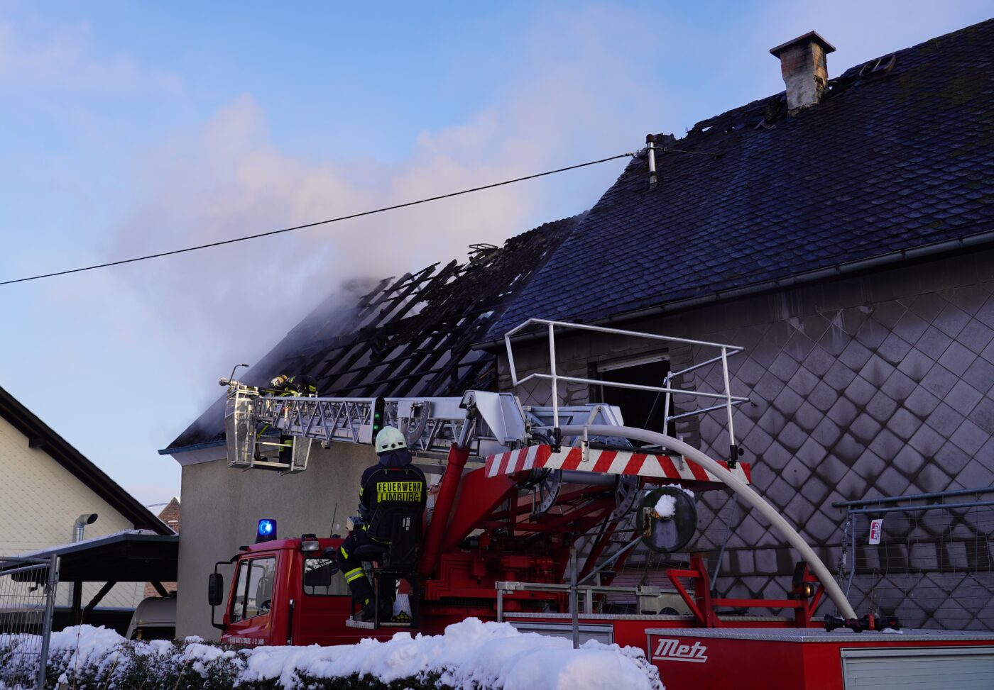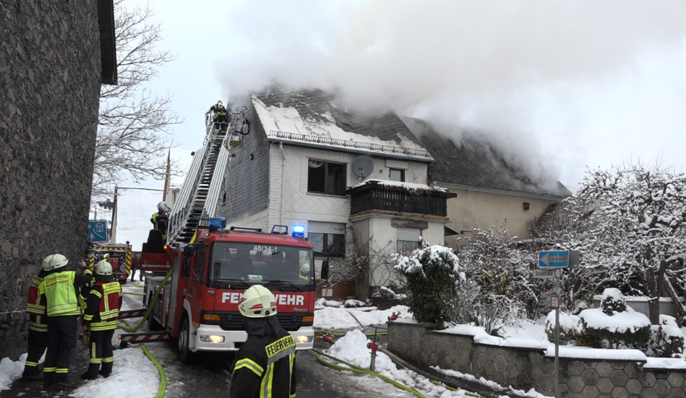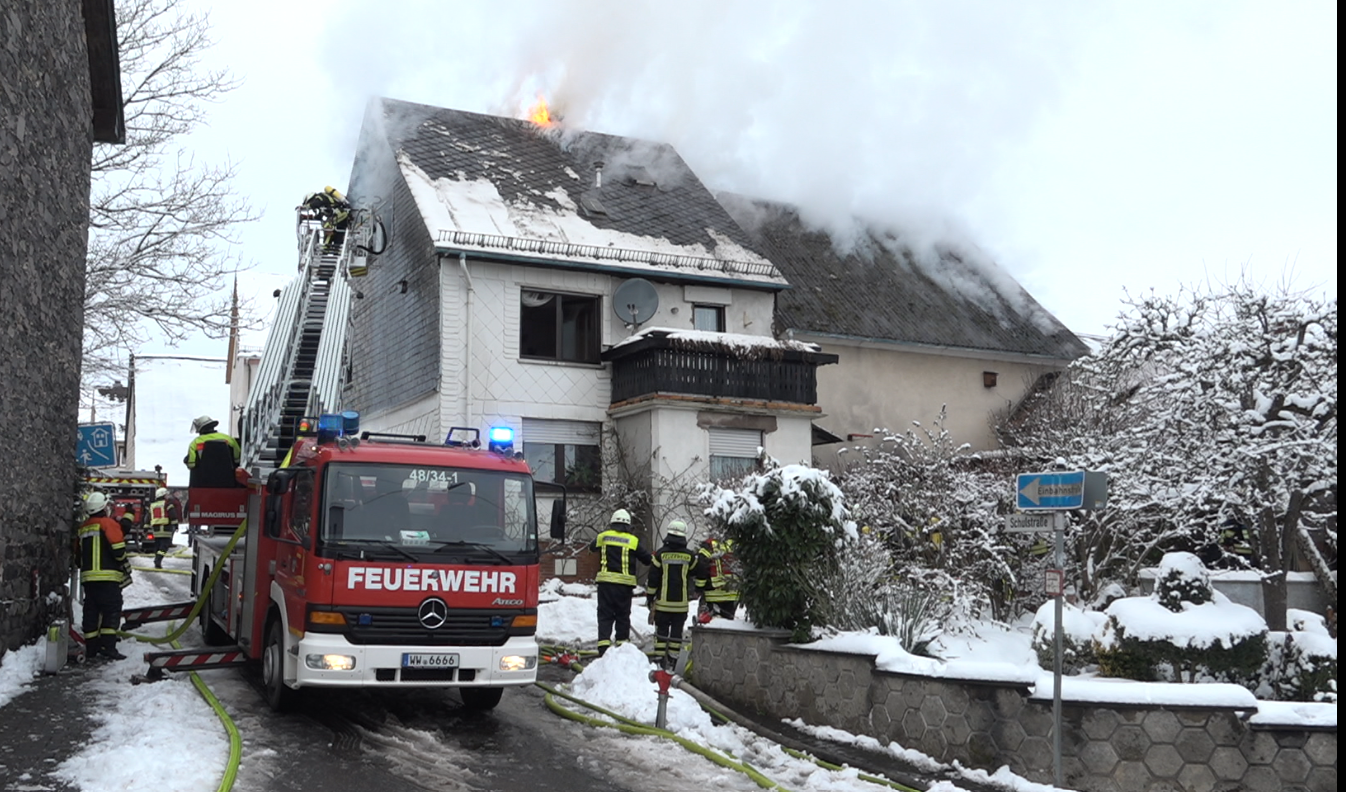 Girod | 19. Januar 2024 | (ww). Zum Vollbrand einer Scheune in der Orstmitte von Girod wurden heute Nachmittag gegen 14 Uhr zunächst Teile der Feuerwehr der Verbandsgemeinde Montabaur alarmiert. Bereits auf der Anfahrt stellte sich heraus, dass es sich um einen größeren Brand handelte, es erfolgten umfangreiche Nachalarmierungen. Kurze Zeit später war dann auch vor Ort klar, dass das Feuer mittlerweile auf den Dachstuhl des angebauten Wohngebäudes übergegriffen hatte, weshalb auch die Feuerwehr aus dem benachbarten, hessischen Limburg, mit einer zweiten Drehleiter hinzugezogen wurde. Vorteil der Limburger Drehleiter laut Einsatzleiter Henrik Mansel: sie ist kleiner dimensioniert als andere im Westerwaldkreis verfügbare Drehleitern und deshalb für die enge dörfliche Bebauung bestens geeignet. Die Bewohner konten das Haus selbstständig verlassen.