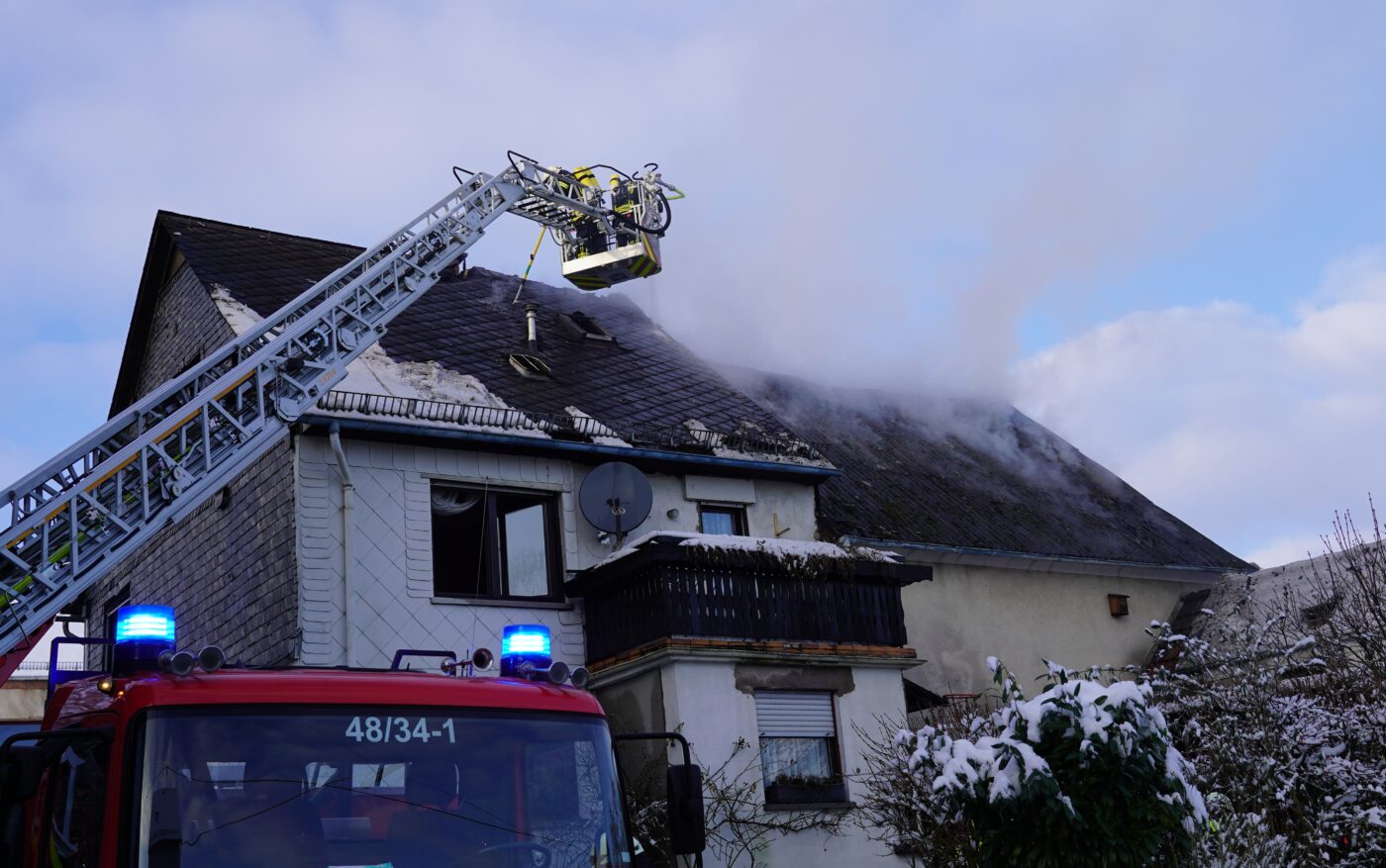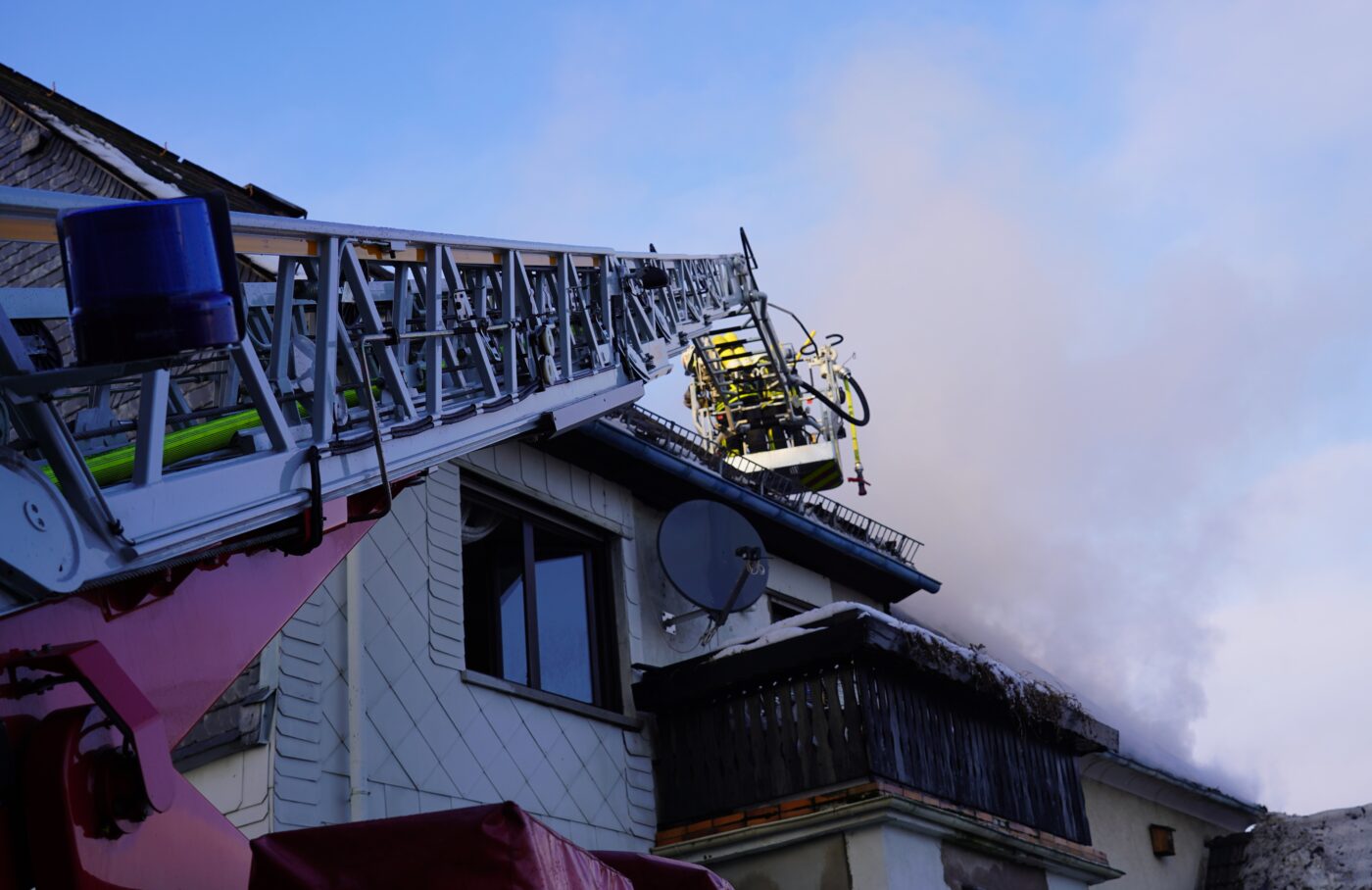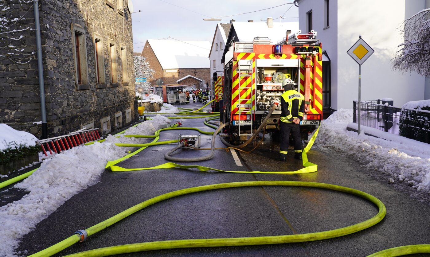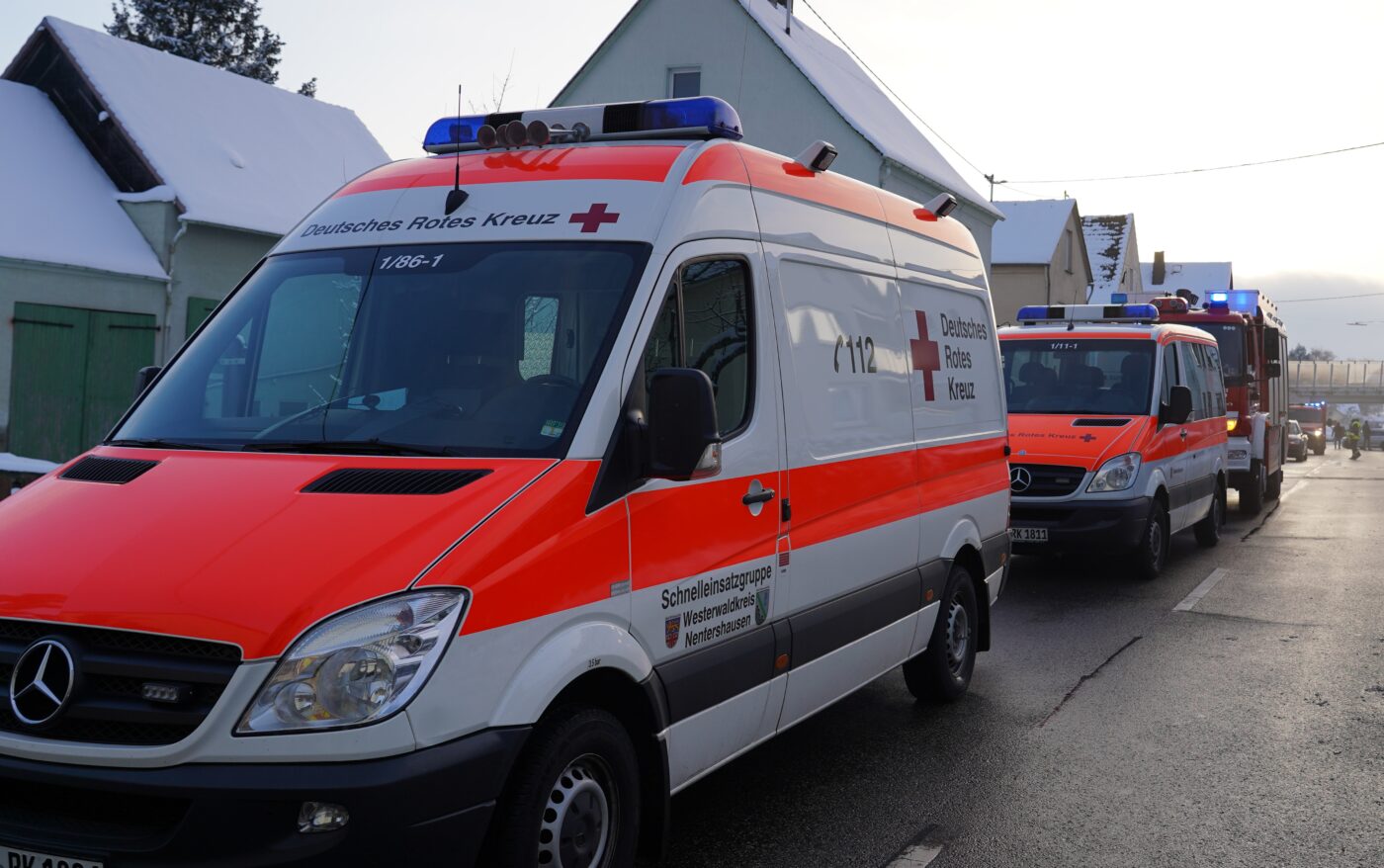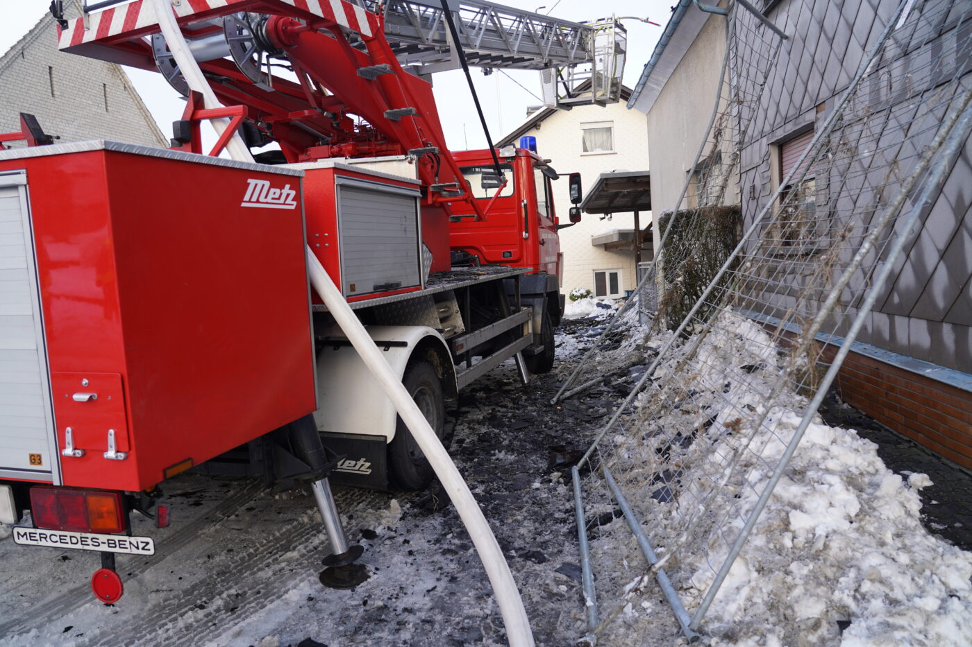 Girod | 19. Januar 2024 | (ww). Zum Vollbrand einer Scheune in der Orstmitte von Girod wurden heute Nachmittag gegen 14 Uhr zunächst Teile der Feuerwehr der Verbandsgemeinde Montabaur alarmiert. Bereits auf der Anfahrt stellte sich heraus, dass es sich um einen größeren Brand handelte, es erfolgten umfangreiche Nachalarmierungen. Kurze Zeit später war dann auch vor Ort klar, dass das Feuer mittlerweile auf den Dachstuhl des angebauten Wohngebäudes übergegriffen hatte, weshalb auch die Feuerwehr aus dem benachbarten, hessischen Limburg, mit einer zweiten Drehleiter hinzugezogen wurde. Vorteil der Limburger Drehleiter laut Einsatzleiter Henrik Mansel: sie ist kleiner dimensioniert als andere im Westerwaldkreis verfügbare Drehleitern und deshalb für die enge dörfliche Bebauung bestens geeignet. Die Bewohner konten das Haus selbstständig verlassen.