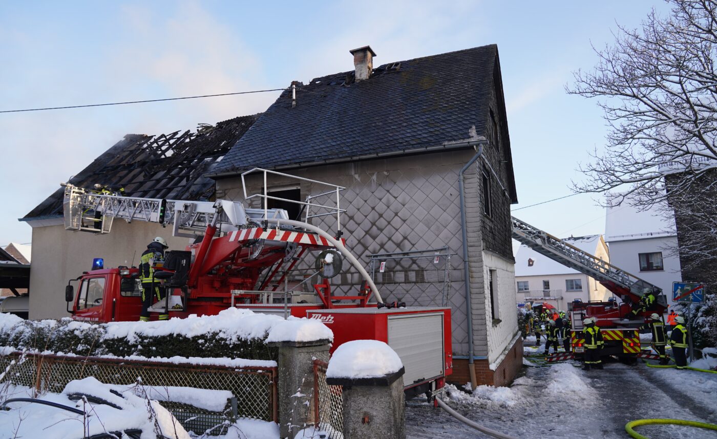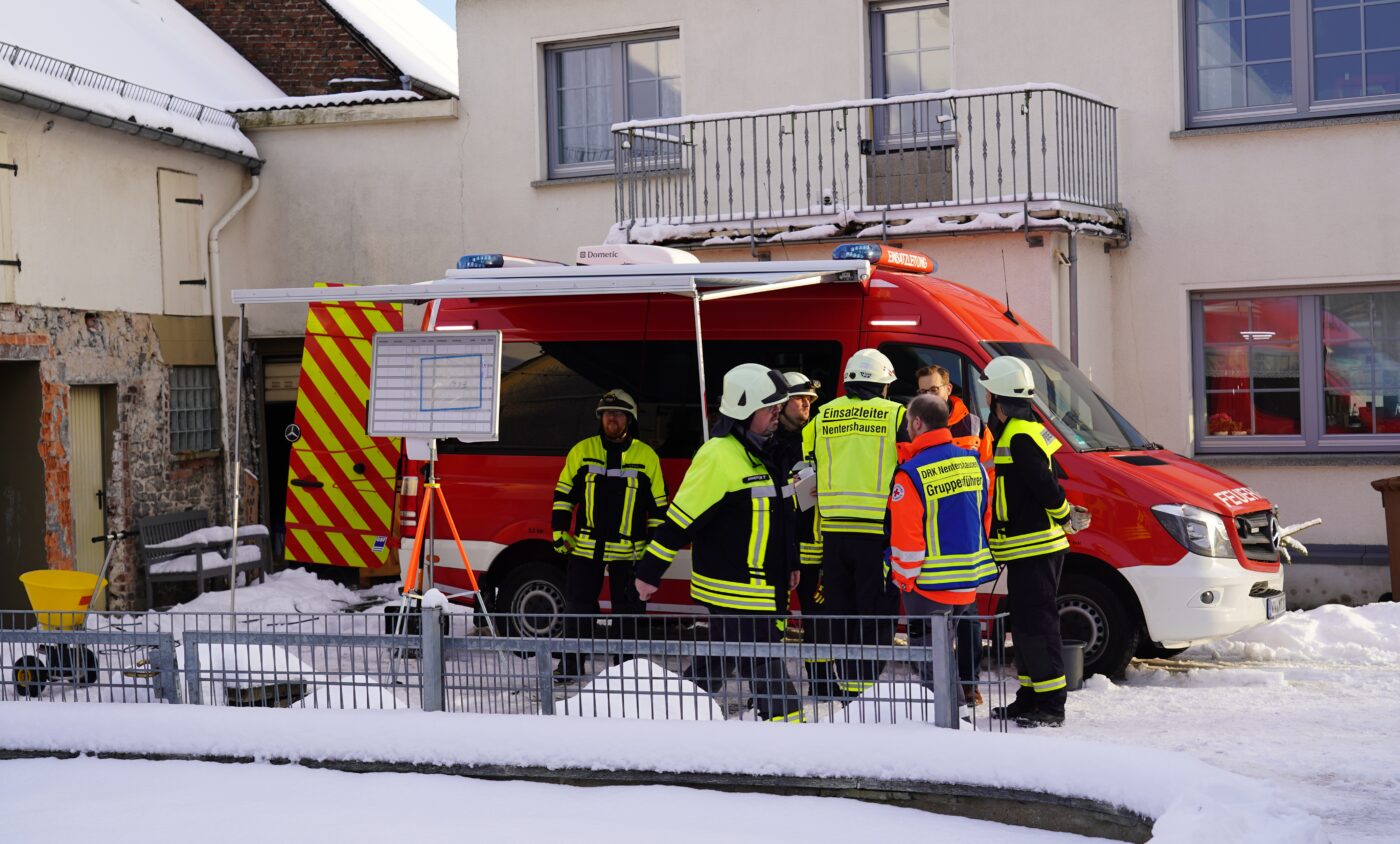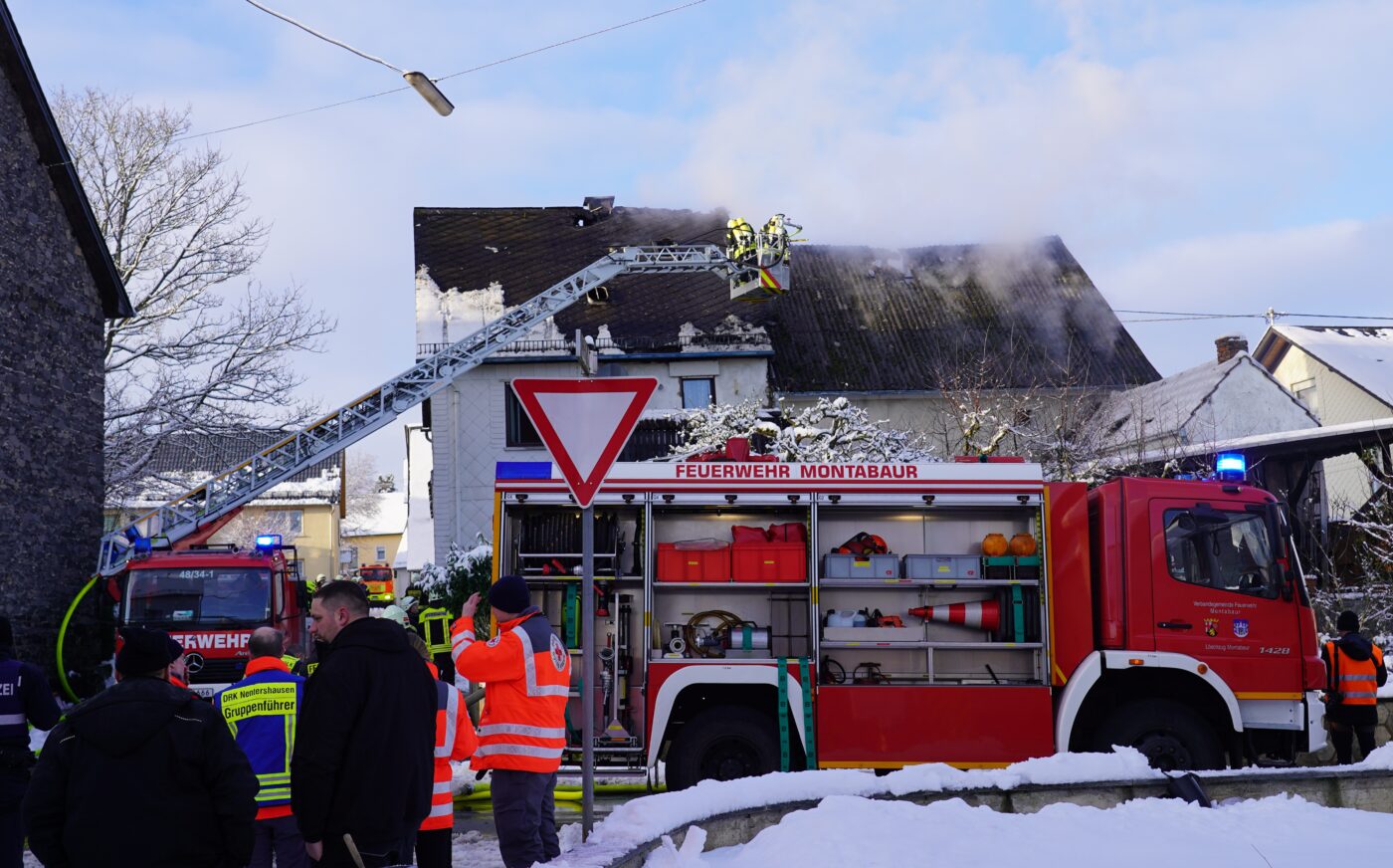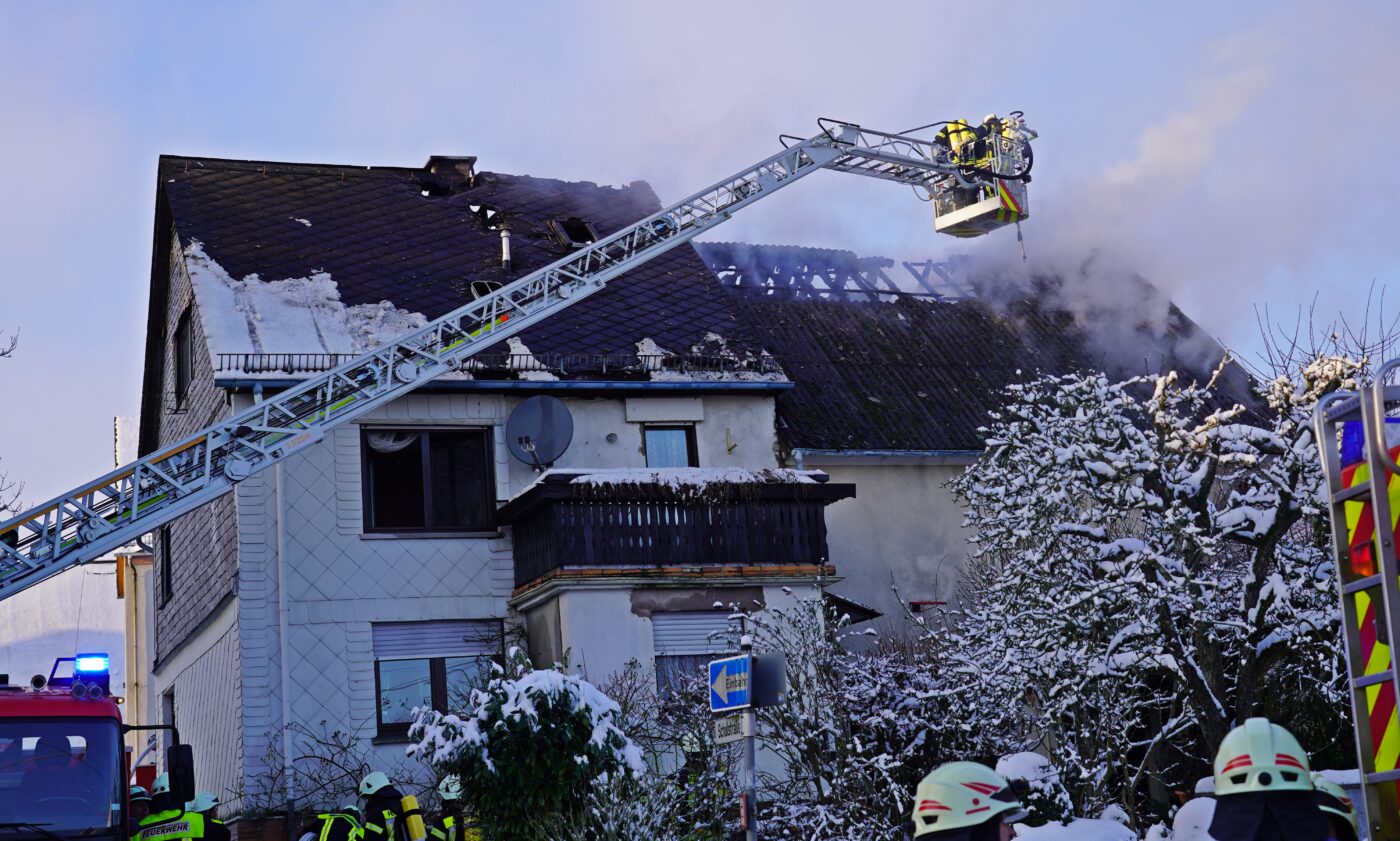 Girod | 19. Januar 2024 | (ww). Zum Vollbrand einer Scheune in der Orstmitte von Girod wurden heute Nachmittag gegen 14 Uhr zunächst Teile der Feuerwehr der Verbandsgemeinde Montabaur alarmiert. Bereits auf der Anfahrt stellte sich heraus, dass es sich um einen größeren Brand handelte, es erfolgten umfangreiche Nachalarmierungen. Kurze Zeit später war dann auch vor Ort klar, dass das Feuer mittlerweile auf den Dachstuhl des angebauten Wohngebäudes übergegriffen hatte, weshalb auch die Feuerwehr aus dem benachbarten, hessischen Limburg, mit einer zweiten Drehleiter hinzugezogen wurde. Vorteil der Limburger Drehleiter laut Einsatzleiter Henrik Mansel: sie ist kleiner dimensioniert als andere im Westerwaldkreis verfügbare Drehleitern und deshalb für die enge dörfliche Bebauung bestens geeignet. Die Bewohner konten das Haus selbstständig verlassen.