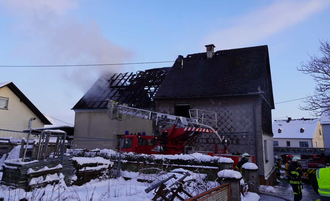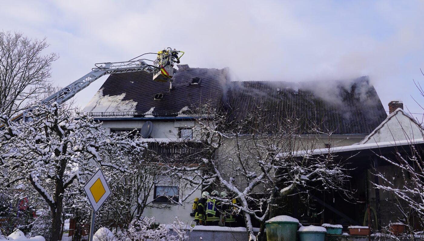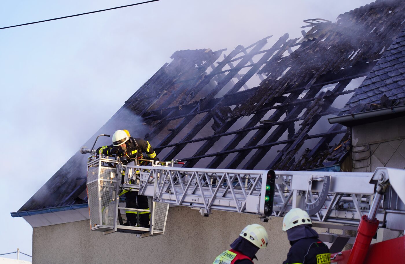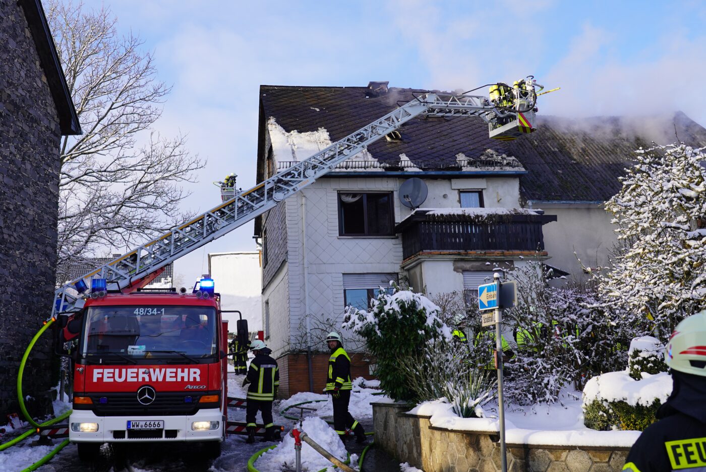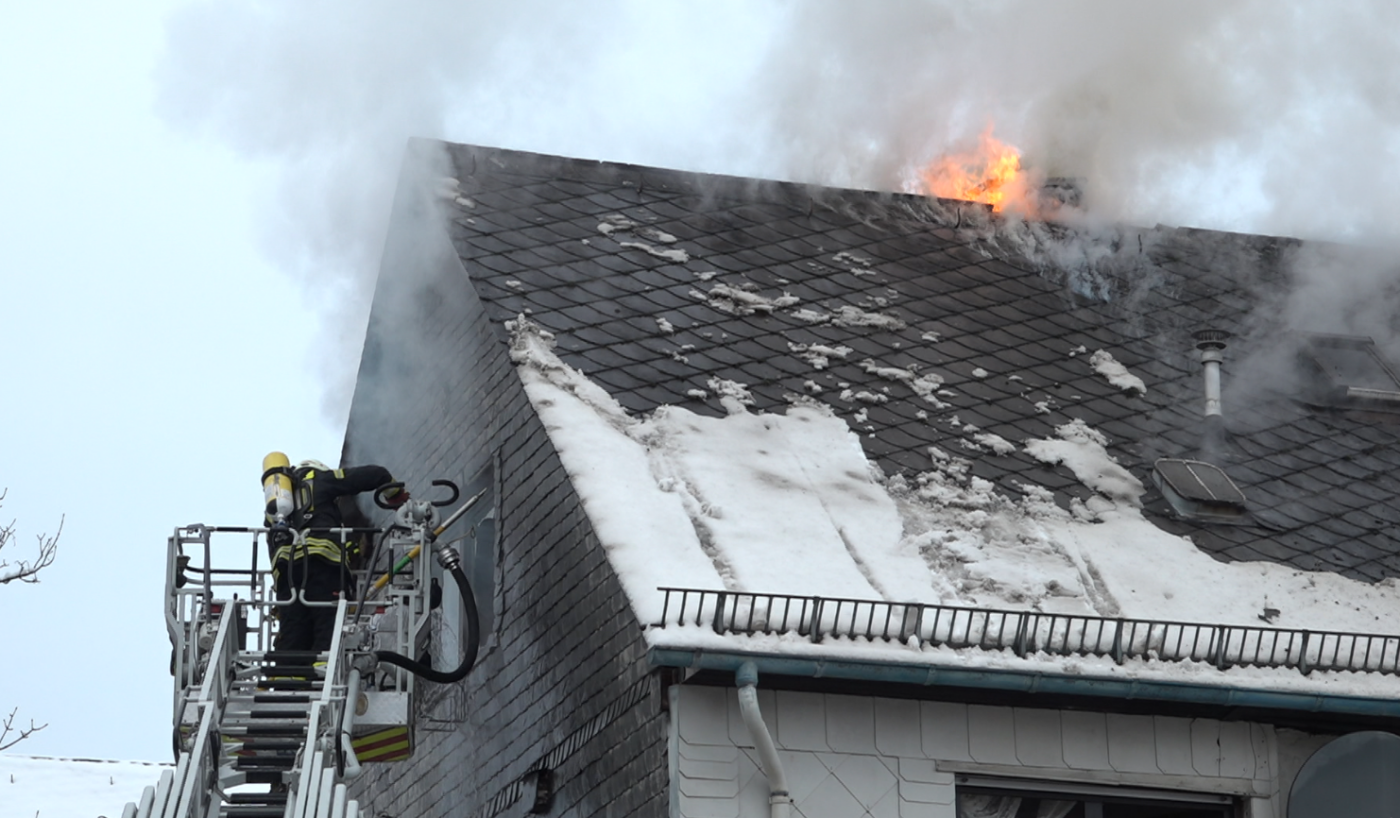 Girod | 19. Januar 2024 | (ww). Zum Vollbrand einer Scheune in der Orstmitte von Girod wurden heute Nachmittag gegen 14 Uhr zunächst Teile der Feuerwehr der Verbandsgemeinde Montabaur alarmiert. Bereits auf der Anfahrt stellte sich heraus, dass es sich um einen größeren Brand handelte, es erfolgten umfangreiche Nachalarmierungen. Kurze Zeit später war dann auch vor Ort klar, dass das Feuer mittlerweile auf den Dachstuhl des angebauten Wohngebäudes übergegriffen hatte, weshalb auch die Feuerwehr aus dem benachbarten, hessischen Limburg, mit einer zweiten Drehleiter hinzugezogen wurde. Vorteil der Limburger Drehleiter laut Einsatzleiter Henrik Mansel: sie ist kleiner dimensioniert als andere im Westerwaldkreis verfügbare Drehleitern und deshalb für die enge dörfliche Bebauung bestens geeignet. Die Bewohner konten das Haus selbstständig verlassen.