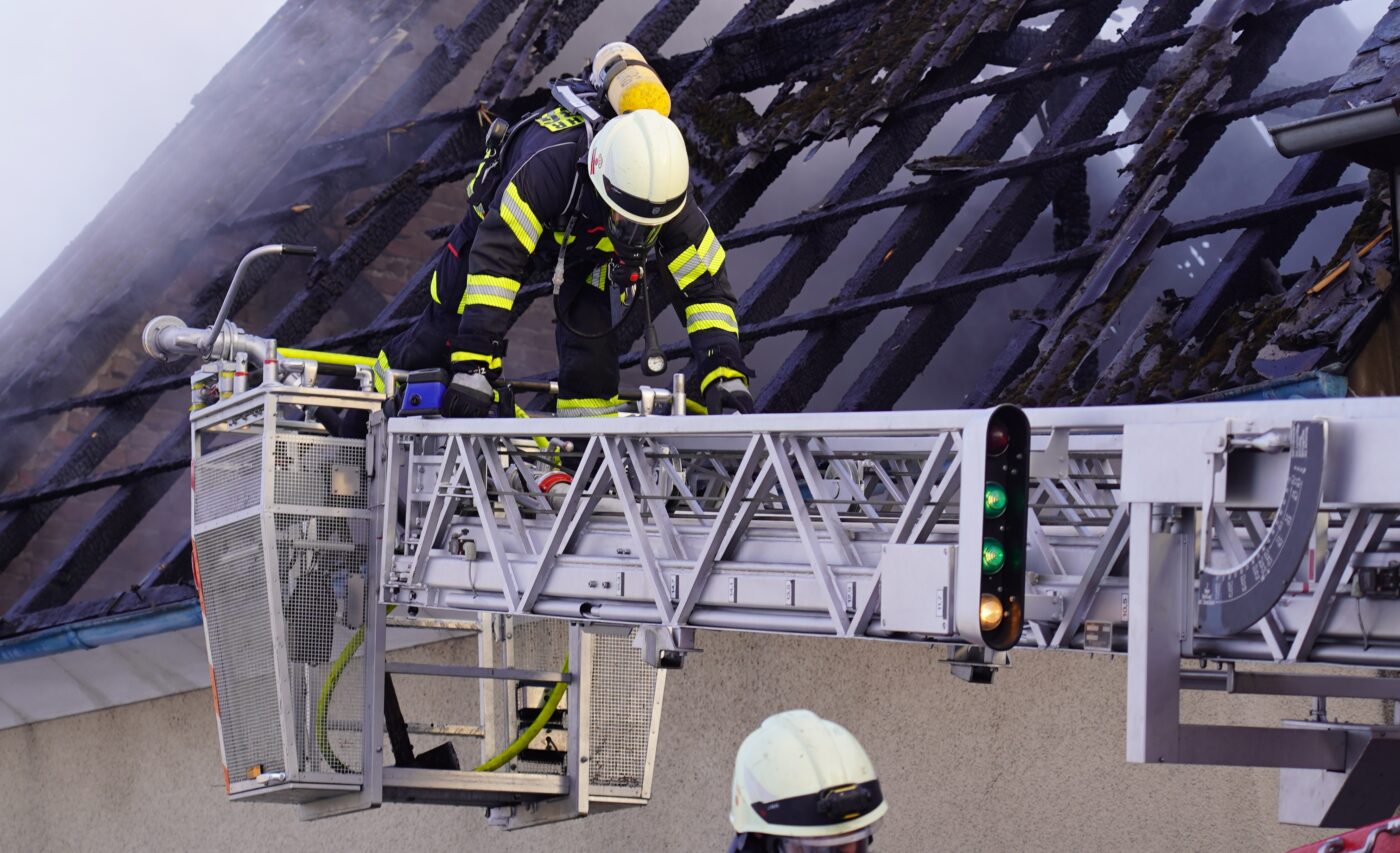 Die Scheune wurde im Verlauf der Löscharbeiten als einsturzgefährdet eingestuft, weshalb die Löscharbeiten nur noch über die beiden Drehleitern von außen erfolgen konnten. Trupps unter Atemschutz versuchten den Schaden im Wohnhaus möglichst gering zu halten, einzelne Glutnester wurden dort mit möglichst wenig Löschwasser bekämpft, eindringendes Löschwasser wurde deshalb im Wohnbereich sogar mit einem Wassersauger wieder aufgenommen