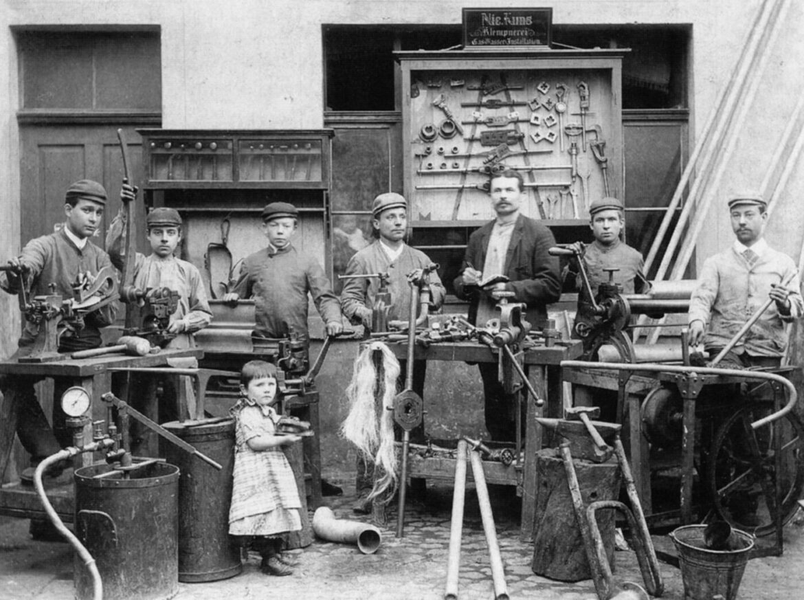 Die „Nic. Kuns – Klempnerei“ wurde 1889 gegründet und ist in der Handwerksrolle der HwK Koblenz als eine der ältesten Eintragungen mit der Nummer 8347 abgelegt. Das Unternehmen in der Bopparder Oberstraße 92 bestand bis 1969 in zwei Generationen. Das Werk von Vater Nicolaus setzte ab 1939 Sohn Ludwig Kuns fort, der ehrenamtlich auch als Obermeister aktiv war. Dessen Schwester Margarete Kuns – im Bild als junges Mädchen im Vordergrund – betrieb nach der Schließung der Klempnerei 1969 am gleichen Standort mit Schwester Maria ein Porzellangeschäft. Heute befindet sich in der Oberstraße 92 ein Eiscafé. Die Besitzerin des Hauses, Elisabeth Fußhöller, ist die Nichte des letzten Handwerksmeisters Ludwig Kuns und berichtet über das Foto: „Das war die Werkstatt auf dem Hof, die später abgerissen wurde. Direkt darunter befindet sich ein römischer Weinkeller, der unmittelbar neben der Römermauer aus dem 4. Jahrhundert liegt und noch heute begehbar ist. So hatten die Kuns ihren Handwerksbetrieb vor fast 136 Jahren dort errichtet, wo bereits 15 Jahrhunderte vorher die Römer ihre baulichen Spuren hinterlassen haben.“