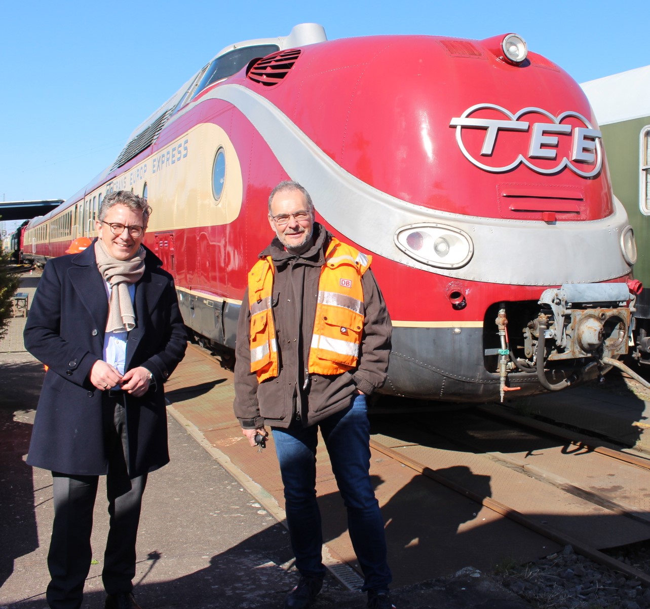 Koblenz | 14. Mai 2022 | (ms). Die Zweigstelle des Deutsche Bahn Museums in Lützel gehört zu den weniger bekannten Museen der Region – obwohl es eigentlich sehr viel zu bieten hat. Für ein aktuelles Projekt, welches das Museum zeitnah umsetzen will, erhofft man sich Unterstützung durch den Bund. Eine Angelegenheit, die der Koblenzer Bundestagsabgeordnete Dr. Thorsten Rudolph gerne in Berlin unterstützen möchte. Insgesamt vier hauptamtliche Kollegen und Kolleginnen und eine Vielzahl an ehrenamtlichen Helferinnen und Helfern sammeln, pflegen und restaurieren in Lützel alte Lokomotiven, Triebwagen und Waggons – mehr als 100 Eisenbahnfahrzeuge kann das Koblenzer Museum präsentieren. Das Herzstück der Ausstellung bleibt jedoch der VT 11.5, einer der berühmtesten Züge der Deutschen Bahn, mit dem man in den 60er Jahren vom Koblenzer Hauptbahnhof in die großen Hauptstädte des westlichen Europas reisen konnte. Der sogenannte Trans-Europ-Express-Verkehr (TEE) soll mittlerweile als TEE 2.0 wieder aufgenommen werden – an den konkreten Plänen hierzu arbeitet inzwischen sogar das Bundesverkehrsministerium. In diesem Zusammenhang strebt das DB-Museum eine umfangreiche Restauration des einzigen noch erhaltenen TEE-Zuges an. Ein entsprechender Förderantrag liegt bereits vor. Für das Projekt will sich der SPD-Politiker Rudolph in Berlin auch weiterhin stark machen. Denn in Lützel ruht ein bedeutendes Stück deutscher Technikgeschichte, mit dem man heute wieder Brücken schlagen kann, um zu einer Renaissance eines umweltfreundlichen Reiseverkehrs in Europa zu kommen, so Rudolph bei seinem Besuch.