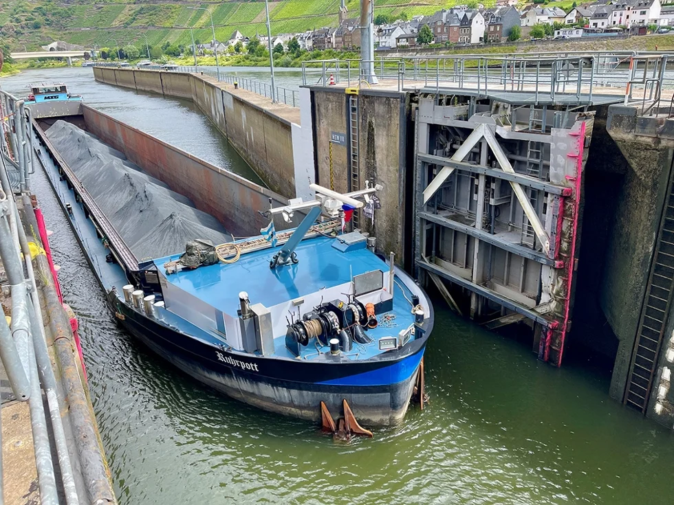Schleuse St. Aldegund / Mosel | 8. Juli 2025 | (ww). Am 2. Juli gegen 16.10 Uhr rammte ein Fahrgastkabinenschiff das Untertor der Schleuse St. Aldegund. Nur zweieinhalb Tage später hatte das WSA Mosel-Saar-Lahn das Tor soweit notinstandgesetzt, dass wieder talwärts geschleust werden konnte. Allerdings unter ständiger Kontrolle der deformierten Torflügel, ob weitere Verformungen auftreten. Zwischenzeitlich konnten 48 Schiffe per Notschleusung ihre Reise zu Tal fortsetzen. Heute, nur sechs Tage später, konnten auch die ersten Bergschleusungen erfolgreich durchgeführt werden. Gegen 12 Uhr fuhr das erste Schiff moselaufwärts in die Schleusenkammer ein und wurde unter ganz besonderer Beobachtung ins Oberwasser geschleust. Vorher wurde das beschädigte Untertor noch einmal gründlich von den Beschäftigten des Außenbezirkes Bullay und den WSA-eigenen Tauchern untersucht. Die erfreuliche Nachricht war, dass es bisher nicht zu weiteren auffälligen Torveränderungen gekommen ist.