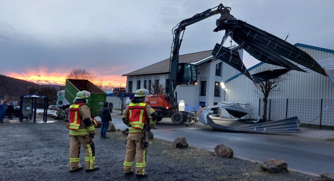 Der Sturm hatte das Blechdach mitsamt der installierten Fotovoltaikanlage auf einer Fläche von rund 200 Quadratmetern ab-gedeckt und weggeweht, lediglich ein schmaler Streifen der Dachbleche und eine handvoll Fotovoltaikelemente war auf dem Dach verbleiben, musste aber mit Hilfe der Drehleiter abgeräumt werden. Die Elemente wurden auf ein angrenzendes Produktionsgebäude, einen Zaun und die L322 geweht. Ein Großteil des Daches kam quasi am Stück jenseits der Landesstraße zum Liegen. Niemand wurde durch die herabstürzenden Trümmerteile verletzt. Die Einheiten aus Katzenelnbogen, Schönborn und Allendorf waren mit 45 Einsatzräften vor Ort, ein ebenfalls im Gewerbegebiet ansässiges Recyclingunternehmen unterstützte die Aufräumarbeiten mit einem Spezialbagger und Containern.