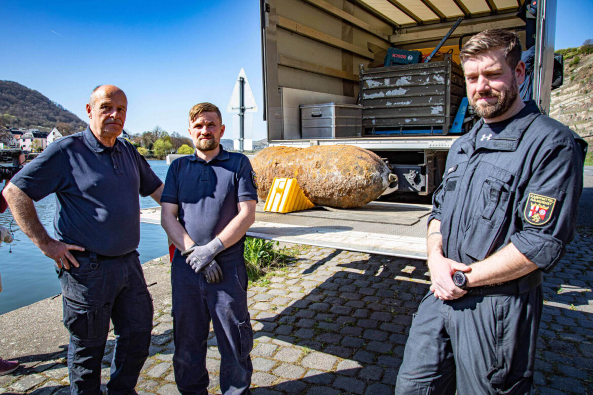 Das Entschärferteam des Kampfmittelräumdienstes Rheinland-Pfalz mit der entschräften 500-Kilogramm-Bombe (von links): Kurt Mazzucco, Tobias Fochler und Sascha Hummrich.