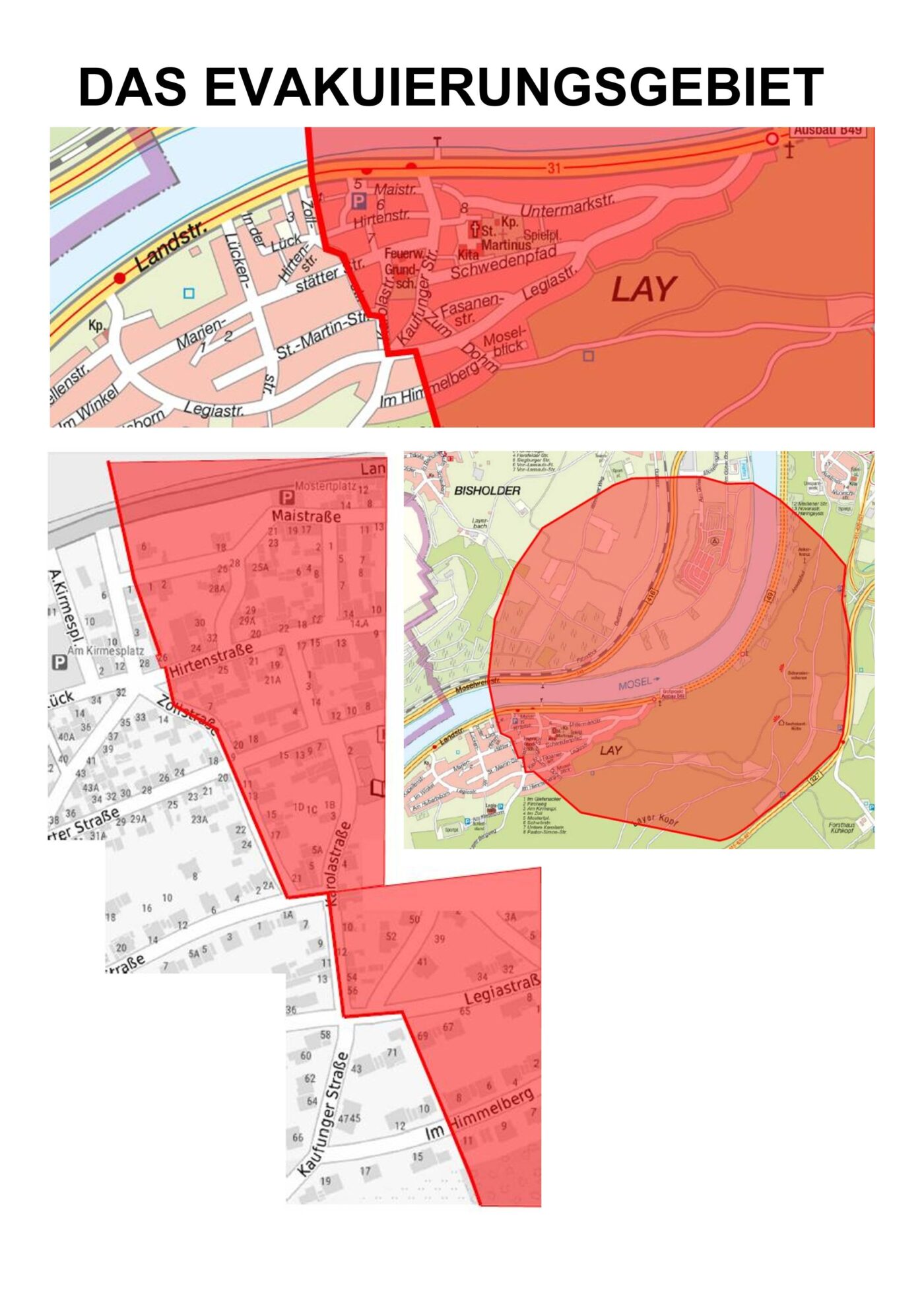 Betroffen ist dort ein Bereich des Stadtteils Lay, die dortige Kindertagesstätte sowie der Campingplatz Güls, der Sportboothafen, die Bahnstrecke entlang der Mosel und die Bundesstraßen 416 und 49. Die Bundesstraße 327 (Hunsrückhöhenstraße) wird befahrbar bleiben. Am Entschärfungstag, Mittwoch, 8. April, muss der Evakuierungsbereich bis 8.30 Uhr verlassen sein. Ab diesem Zeitpunkt darf sich außer den Einsatzkräften niemand mehr in der Evakuierungszone befinden. Erst nach Abschluss der Evakuierung kann der Kampfmittelräumdienst mit der Entschärfung auf dem Baggerschiff auf der Mosel beginnen.