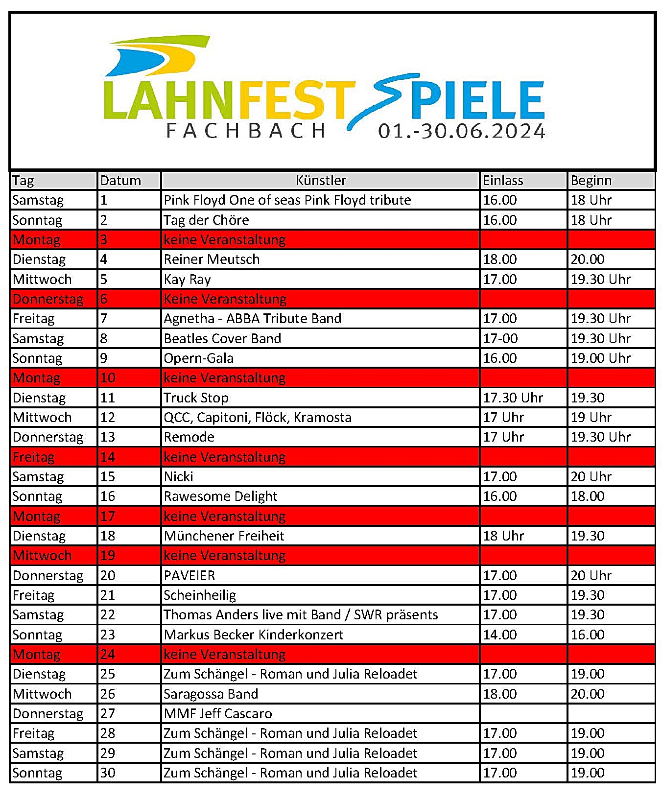 Vom 1. bis zum 30. Juni geben sich Stars- und Sternchen aus allen Ecken der Unterhaltungsbranche die Ehre auf der einhundert Quadratmeter großen Wasserbühne AUF der Lahn am Fachbacher Campingplatz. Von Thomas Anders und Band über die Münchner Freiheit, die Saragossa Band, Truck Stop, Schlagersängerin Nicki, die Paveier, eine Opern-Gala, diverse Coverbands wie etwa „Remode“ (Depeche Mode Cover), Beatles Night, One of These Pink Floyd Tributes, Scheinheilig (Unheilig-Cover) und „AGNETHA“ – Abba-Cover wird wirklich für jeden Musikgeschmack etwas geboten. Auch Comedy-Fans sollen nicht zu kurz kommen, genauso wie Freunde höchstklassiger A-capella-Formationen. Mit Markus Becker und seinem roten Pferd widmen sich die Lahnfestspiele einen Tag lang den jüngsten Besuchern und auch der Schirmherr der Festspiele, Reiner Meutsch, wird seinem „Abenteuer Weltumrundung“ in Fachbach ein weiteres Kapitel hinzufügen. Und das war noch lange nicht alles…