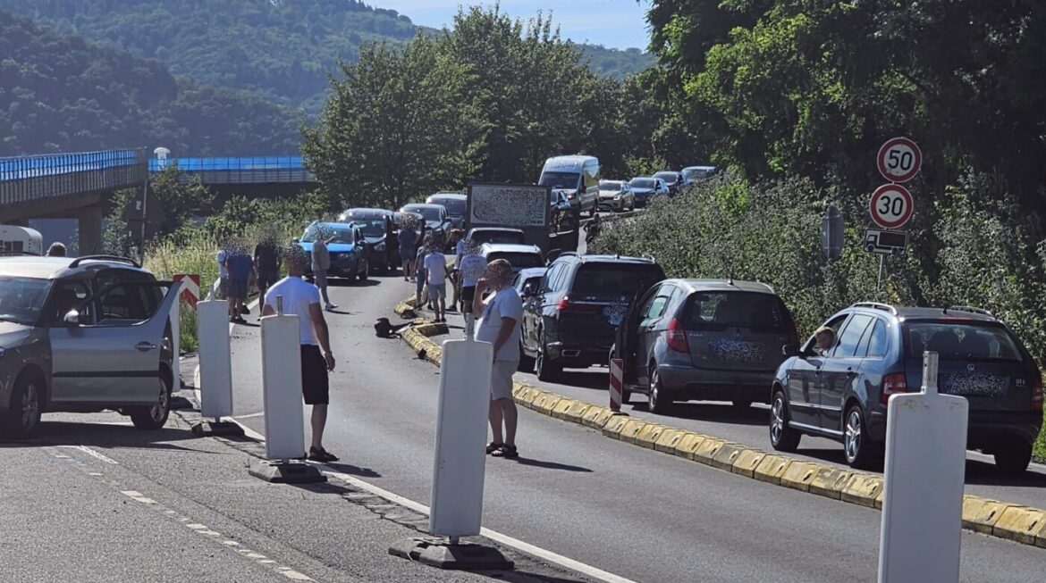 Lahnstein | 28. Juni 2024 | (ww). Im provisorischen Übergang von der B42 auf die B260 ist es heute kurz vor 17 Uhr erneut zu einem Unfall gekommen, der die vielbefahrene Umleitungsstrecke für die Brückensanierung für rund eine Stunde blockierte. Nach bislang offiziell noch nicht bestätigten Angaben von vor Ort, hat wohl ein Fahrzeug die massive, gelbe Fahrbahntrennung durchbrochen, bzw. sei darauf hängen geblieben. Wie schon mehrmals zuvor haben sich die Fahrbahntrenner dabei so verschoben, dass zunächst in beide Richtungen kein Weiterkommen mehr möglich war. Gegen 17.45 Uhr gab die Polizei auf telefonische Nachfrage an, dass der Verkehr langsam wieder anrolle, allerdings später noch weitere Arbeiten zum Wiederaufstellen des Fahrbahntrenners erforderlich seien. Weitere Angaben zum Unfall gab es bislang noch nicht.
