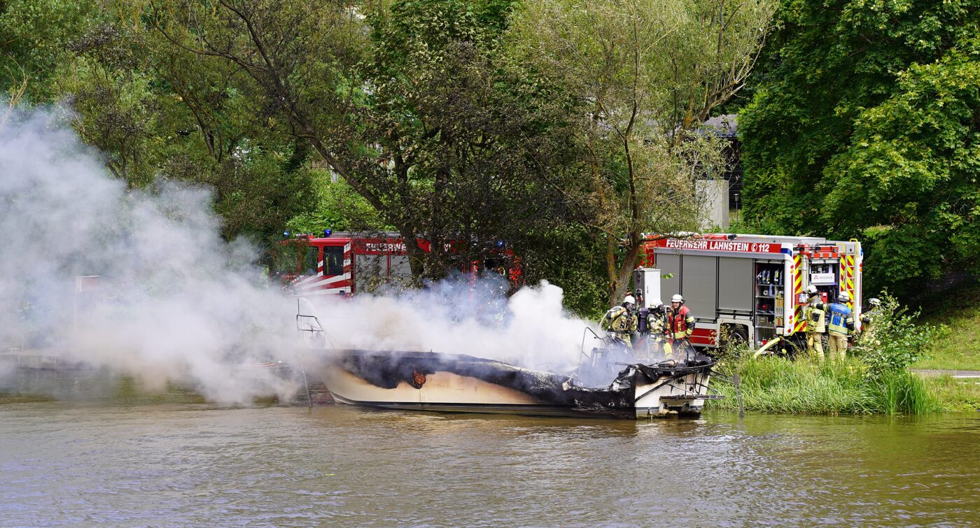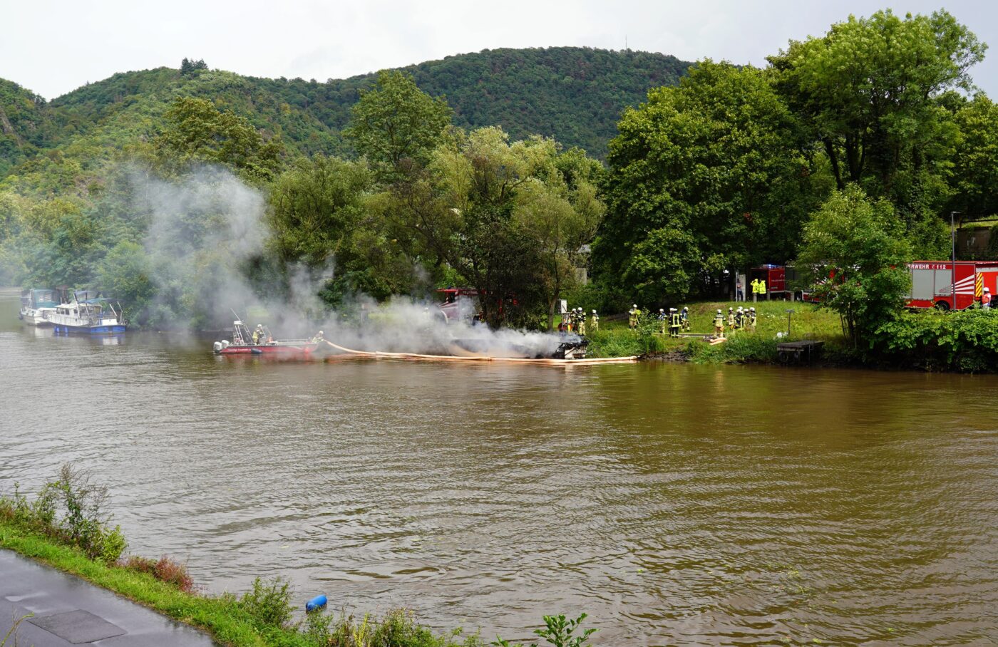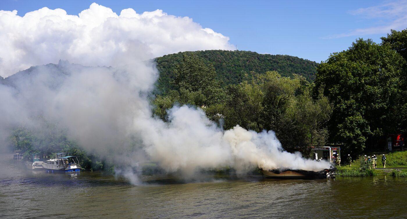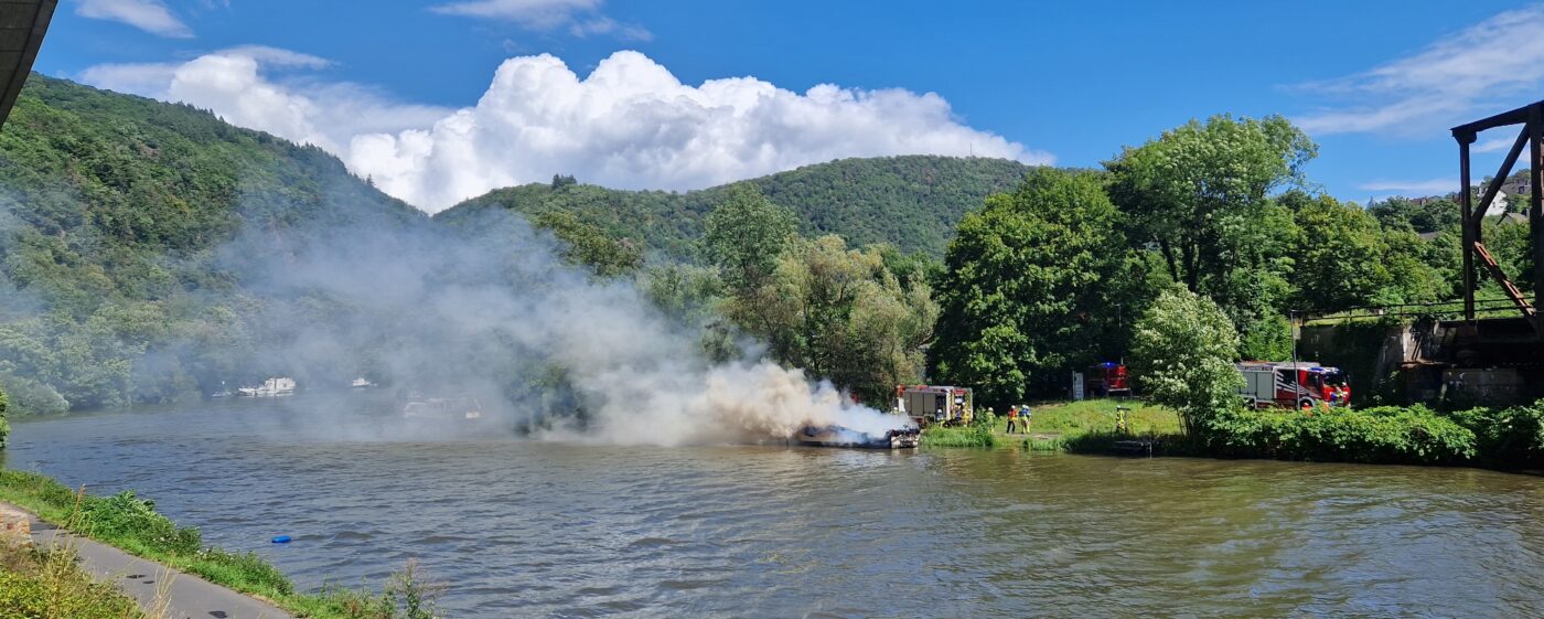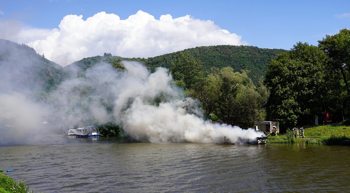 Lahnstein | 1. August 2023 | (ww). Dunkle Rauchschwaden wabern heute Mittag durch das Lahntal kurz unterhalb der Ruppertsklamm. Auf der Seite des Lahnsteiner Stadtteils Friedland ist gegen 13.50 Uhr eine Motoryacht angelegt. Der neue Eigner – das Schiff wechselte erst vor Kurzem den Eigentümer – soll laut Angaben vor Ort auf und an seiner „Fairline Mistral 32“ gearbeitet haben. Plötzlich steht das rund 10 Meter lange Schiff in Flammen. Dichter, dunkler Rauch steigt auf, zwei dumpfe Schläge von Verpuffungen folgen, dannn eine „Explosion mit einem großen Feuerball“, berichten Augenzeugen. Einer von ihnen hat auch die Feuerwehr alarmiert – das machen allerdings noch weitere Augen- und Ohrenzeugen.