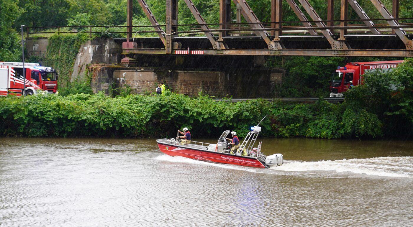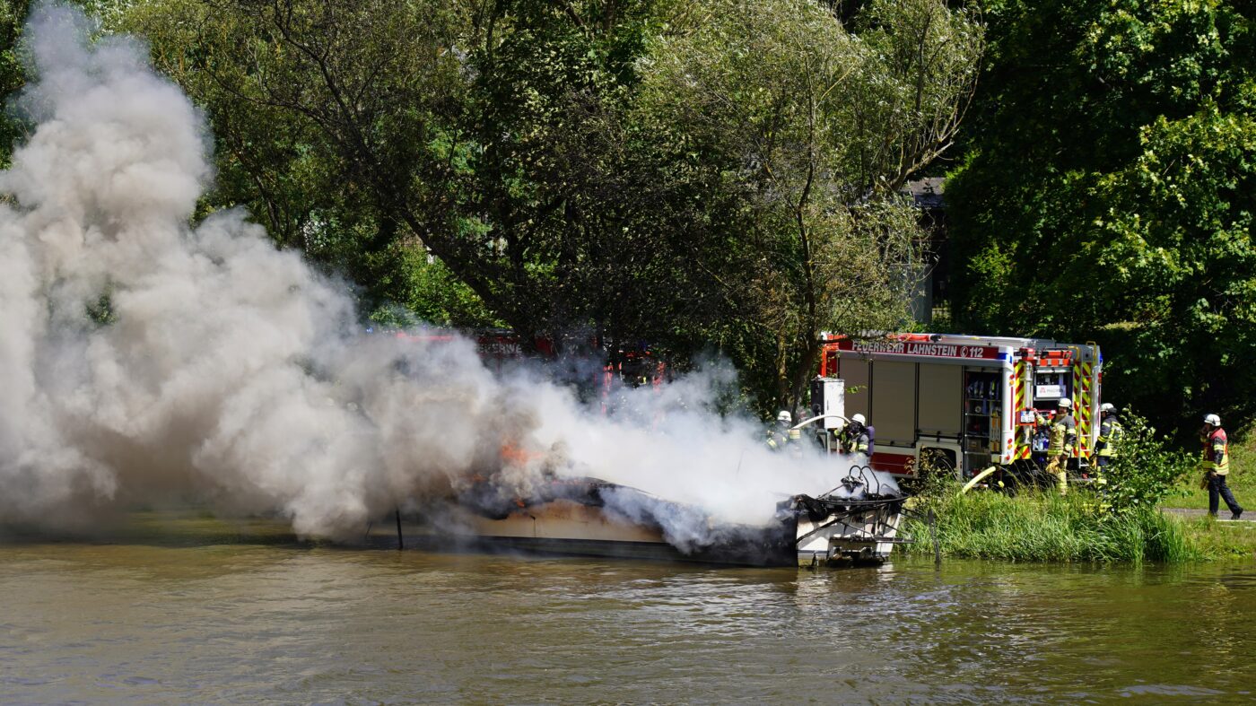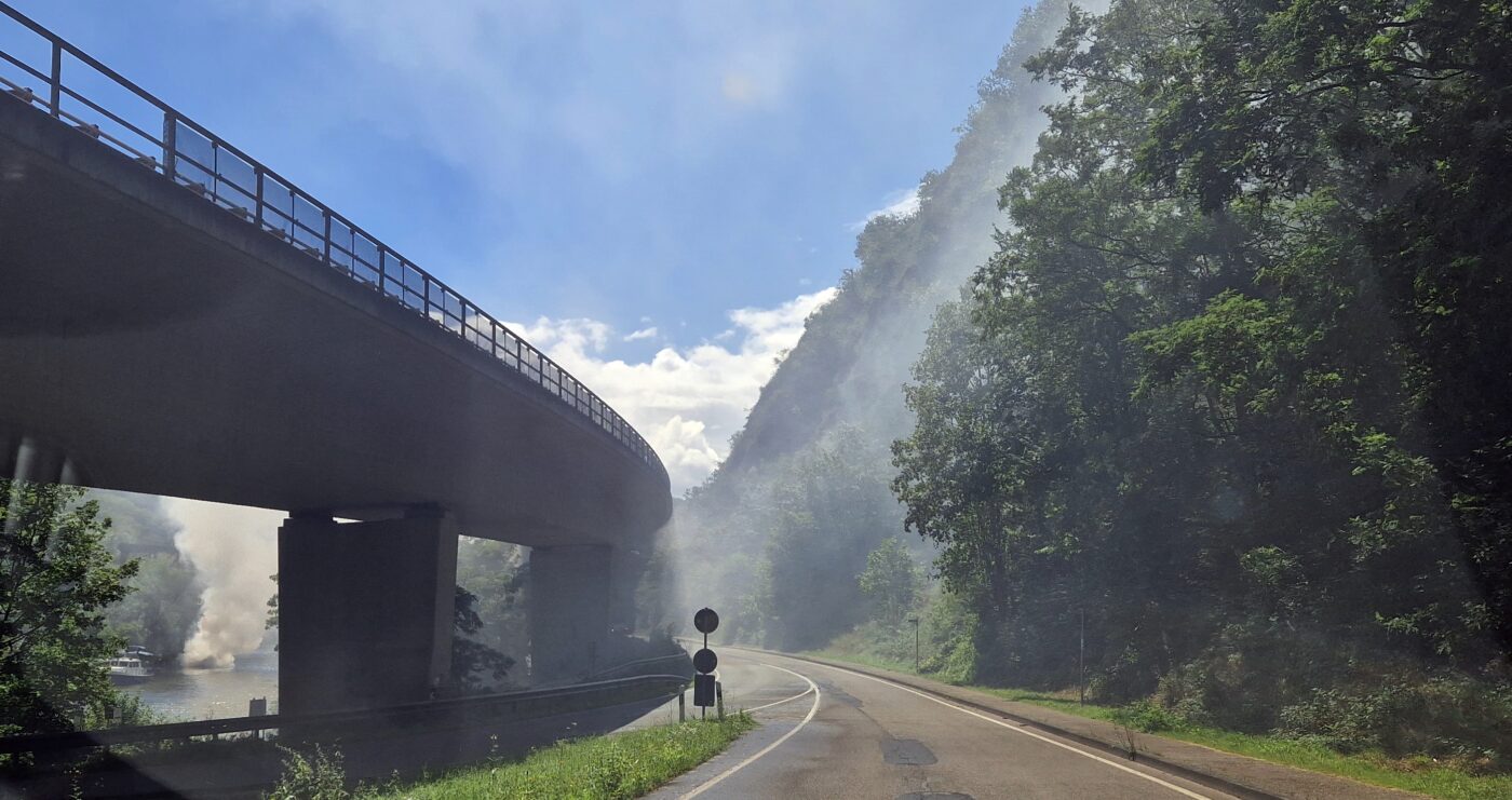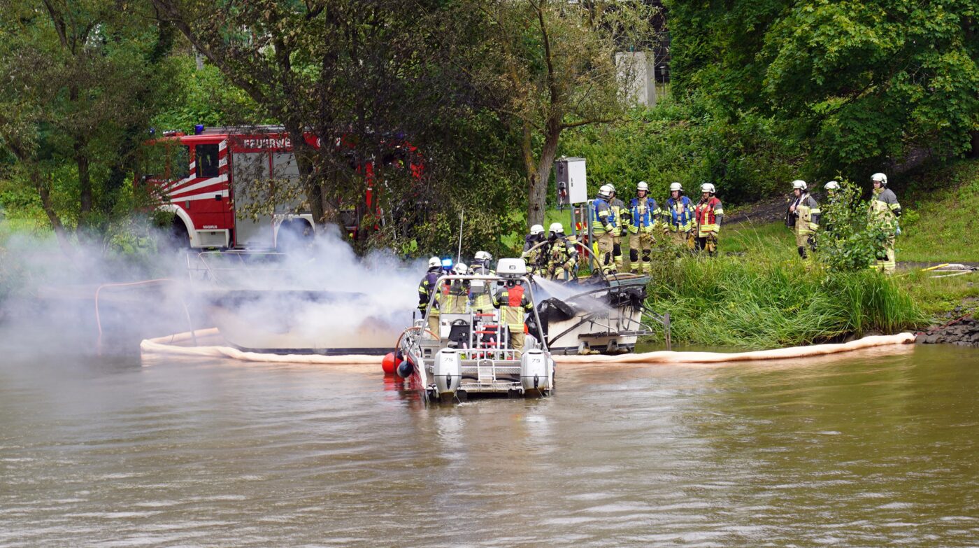 Lahnstein | 1. August 2023 | (ww). Dunkle Rauchschwaden wabern heute Mittag durch das Lahntal kurz unterhalb der Ruppertsklamm. Auf der Seite des Lahnsteiner Stadtteils Friedland ist gegen 13.50 Uhr eine Motoryacht angelegt. Der neue Eigner – das Schiff wechselte erst vor Kurzem den Eigentümer – soll laut Angaben vor Ort auf und an seiner „Fairline Mistral 32“ gearbeitet haben. Plötzlich steht das rund 10 Meter lange Schiff in Flammen. Dichter, dunkler Rauch steigt auf, zwei dumpfe Schläge von Verpuffungen folgen, dannn eine „Explosion mit einem großen Feuerball“, berichten Augenzeugen. Einer von ihnen hat auch die Feuerwehr alarmiert – das machen allerdings noch weitere Augen- und Ohrenzeugen.