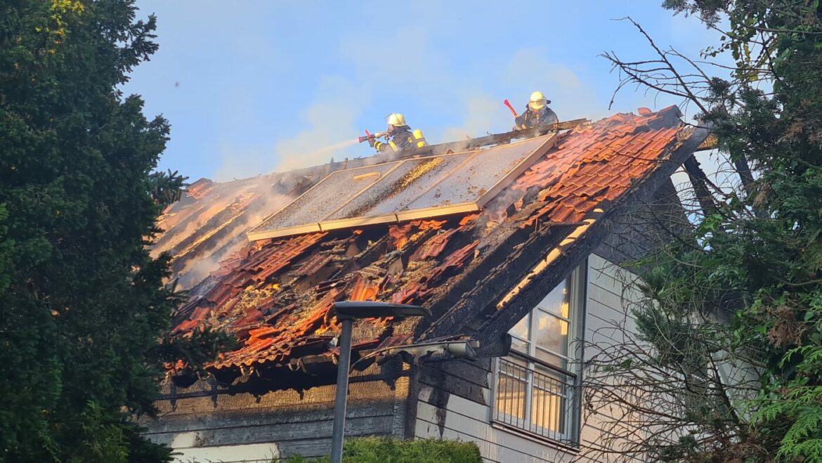 Koblenz| 2. Juni 2022 | (ww). Gegen 19 Uhr wurde die Berufsfeuerwehr Koblenz und die Einheit Karthause zu einem Einsatz in die Straße Am Vogelpark alarmiert. Zunächst lautete die Meldung nach Angaben vor Ort auf einen Wohnungsbrand, ausgelöst durch einen Grill auf dem Balkon. Schon auf der Anfahrt war eine große Rauchsäule über der Karthause zu erkennen, beim Eintreffen der ersten Einsatzkräfte stand das Haus schon im Vollbrand, die Flammen hatten auf den Dachstuhl übergegriffen. Schwierig gestalteten sich die Löscharbeiten, da die schmale Seitenstraße, die auch noch zur Straße Am Vogelpark gehört keinen Einsatz der Drehleiter erlaubte. Mit Steckleitern und C-Rohren gingen die Einsatzkäfte in mühsammer „Handarbeit“ gegen die Flammen vor. Die starke Rauchentwicklung erforderte den massiven Einsatz von Atemschutzgeräteträgern und damit die Nachalarmierung zahlreicher Einheiten. Die Einsatzstelle war weiträumig abgesperrt. Verletzt wurde nach Angaben vor Ort niemand, die Löscharbeiten zogen sich bis in die Nacht hinein.