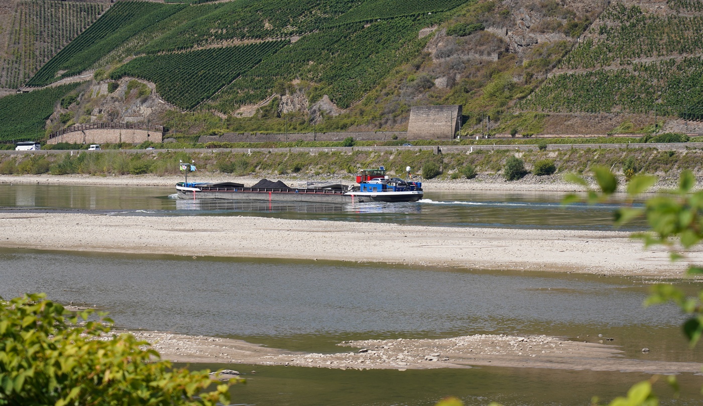 Unser Foto zeigt ein klassisches Niedrigwasser am Rhein aus den vergangenen Jahren: es bleibt nur eine schmale Fahrrinne, die Schifffahrt muss mit deutlich weniger Ladung fahren, um weniger Tiefgang zu haben.