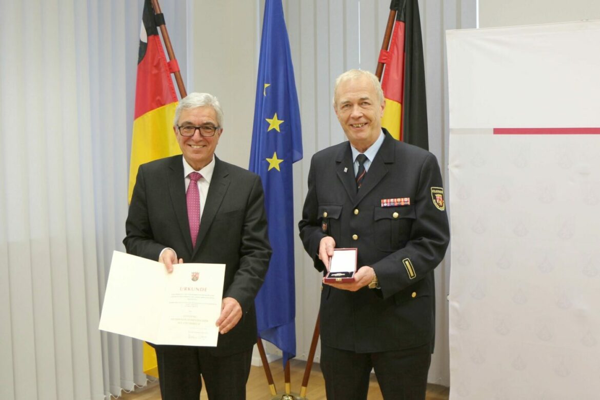 Montabaur | 30. November 2021 | (ww). Innenminister Roger Lewentz hat Brand- und Katastrophenschutzinspekteur a.D. Axel Simonis aus Montabaur (Westerwaldkreis) das Goldene Feuerwehr-Ehrenzeichen als Steckkreuz verliehen. Die Auszeichnung für Verdienste von außerordentlicher Bedeutung für das Feuerwehrwesen in Rheinland-Pfalz wird nur sehr selten vergeben und wurde in den vergangenen zehn Jahren lediglich 34 Personen zuteil.