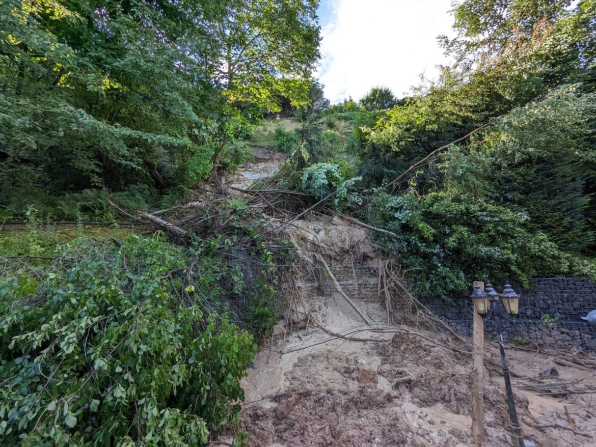 Vallendar | 17. August 2023 | (ms). Die Ursachen für den Hangrutsch, der sich vor gut zwei Wochen in einem Wohngebiet in Vallendar ereignete, werden derzeit von der Struktur- und Genehmigungsdirektion (SGD) Nord intensiv untersucht. In Zusammenarbeit mit dem Landesamt für Geologie und Bergbau wurden nun neue Messpunkte oberhalb und am Fuß der Rutschung installiert, die täglich von einem Vermessungsbüro überwacht werden. Bisher deuten die Messungen nicht auf eine Ausdehnung der Rutschung hin.