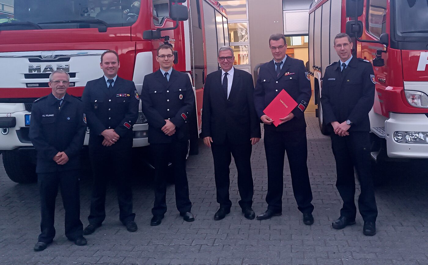 Wahlabend bei der Freiwilligen Feuerwehr Nentershausen: Wehrführer Henrik Mansel (2.v.r.) wurde in seinem Amt bestätigt. Dazu gratulierten (v.l.): der Stellvertretende Wehrleiter Hans-Joachim Klimke, die beiden Stellvertretenden Wehrführer Marvin Schmitt und Alexander Wolff, der Erste Beigeordnete Andree Stein sowie Wehrleiter Jens Weinriefer.