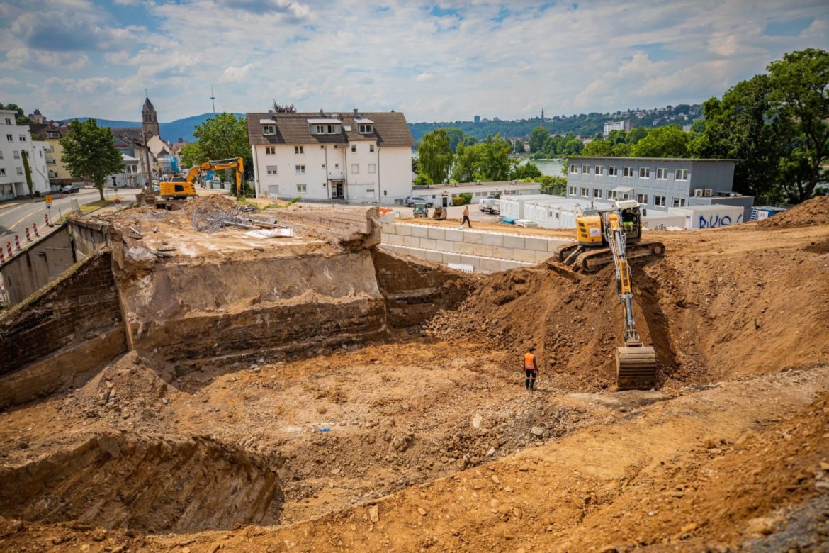 Bild: Auf der Pfaffendorfer Seite wird aktuell Stück für Stück die ehemalige Südrampe der Pfaffendorfer Brücke abgerissen, während gleichzeitig eine provisorische Fußgänger- und Radrampe entsteht. Foto: Stadt Koblenz/Andreas Egenolf