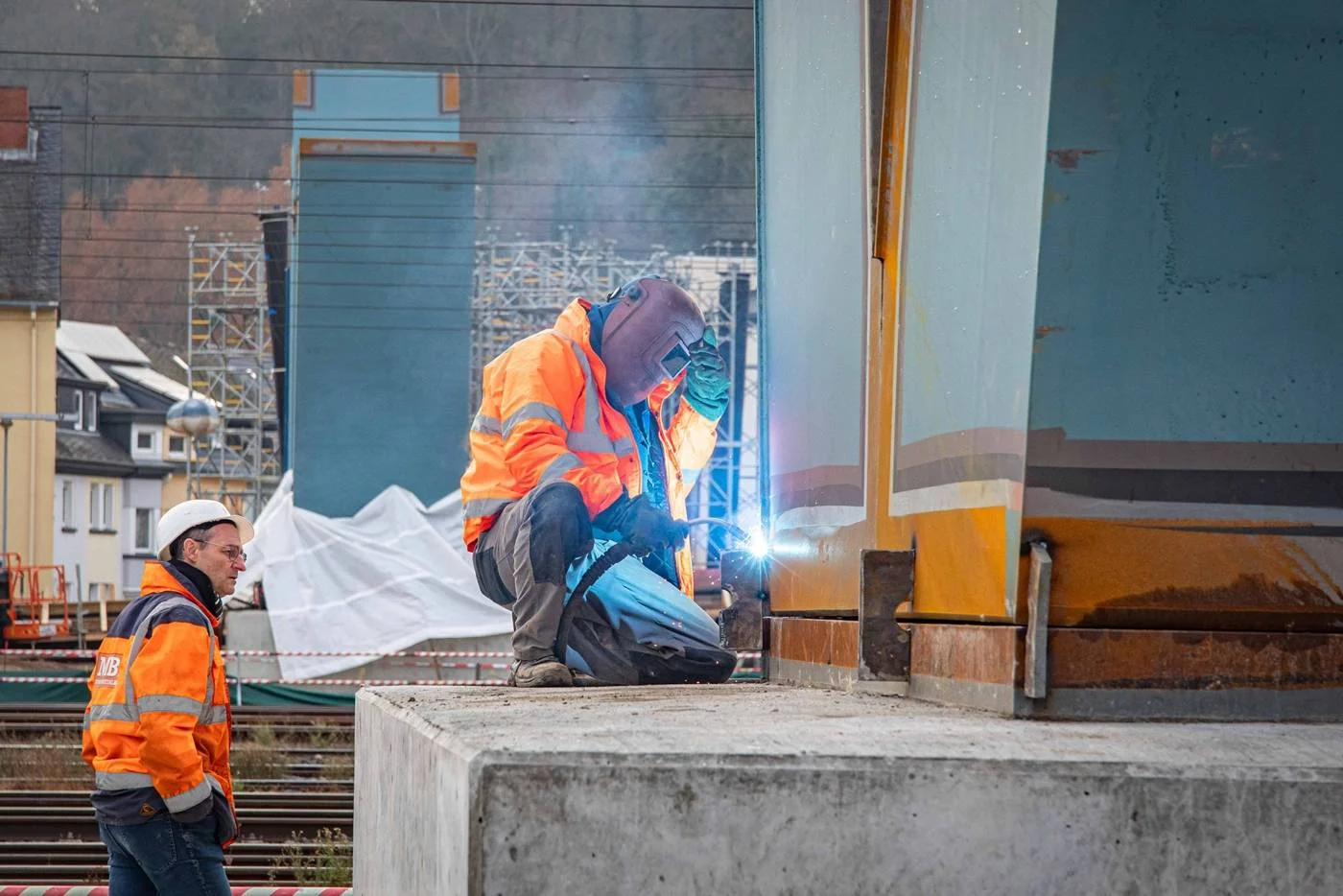 Im Rahmen der vorbereitenden Arbeiten werden in den erforderlichen Bereichen auch Anpassungen im Bereich der Oberleitungen der Bahnstrecke vorgenommen. „Diese sind für die Montage der Hilfsgerüste, die wir zur Herstellung des Brückenüberbaus benötigten, erforderlich“, sagt Kai Mifka. Die Gerüste selbst sollen im Anschluss an die Oberleitungsarbeiten errichtet werden. Sie dienen dann zum einen als temporäres Auflager der Überbauteile und zum anderen als Arbeitsebene für die auf den Einhub folgenden Schweiß- und Beschichtungsarbeiten.