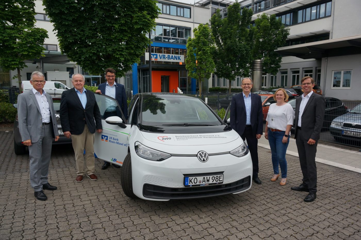 Neuwied/Bendorf | 04. Juli 2022 | (ms). Die Mitarbeiter und Mitarbeiterinnen des Seniorenzentrums Vierwindenhöhe in Bendorf können sich über einen neuen fahrbaren Untersatz freuen. Denn damit die Versorgung der Bewohner und Bewohnerinnen bestmöglich gelingen kann, hat die VR Bank Rhein-Mosel eG dem AWO Bezirksverband Rheinland e.V. ein neues Elektrofahrzeug gespendet. Damit sollen künftig Bewohner und Bewohnerinnen ins Quartier gefahren werden, Besorgungen aus dem Quartier gemacht und die Menschen somit besser vernetzt werden. Beim AWO Bezirksverband, der die Einrichtung in Bendorf leitet, zeigte man sich begeistert von dem neuen E-Auto. Gerade in solchen Zeiten sei eine solche Spende von großer Bedeutung, sagte Andreas Zels, Vorstand des AWO Bezirksverbandes Rheinland e.V. Die Gelder für die Spende stammen dabei aus dem Gewinnsparen der Genossenschaftsbanken. „Von jedem Los fließen monatlich 25 Cent über die VR Bank an gemeinnützige Einrichtungen in unserer Region“, erläutert Michael C. Kuch, Vorstand der VR Bank Rhein-Mosel eG und zeigte sich sehr zufrieden darüber, dass man die AWO bei ihrer täglichen Arbeit im Seniorenzentrum mit dem VR-Mobil unterstützen kann.