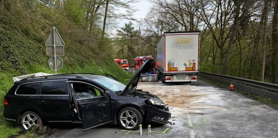 Neustadt | 20. April 2026 | (ww). Am Freitagnachmittag kam es auf der L255 zwischen Neustadt und Etscheid zu einem Unfall zwischen einem LKW und einem Auto mit Anhänger. Der Fahrer des Autos wurde dabei schwer verletzt. Außerdem liefen größere Mengen Diesel aus dem Tank des LKW aus. Gegen 15.40 Uhr wurde die Feuerwehr Neustadt mit dem Stichwort „auslaufende Betriebsstoffe“ zu dem Unfall auf die L255 alarmiert. Beim Eintreffen der ersten Kräfte wurde der schwerverletzte Fahrer des PKW bereits vom Rettungsdienst versorgt und anschließend in ein Krankenhaus gebracht. Bei dem LKW war der Kraftstofftank beschädigt, wodurch eine größere Menge Diesel austrat. Durch die Feuerwehr wurde umgehend der Brandschutz sichergestellt sowie die Unfallstelle abgesichert. Auslaufende Betriebsstoffe wurden abgestreut und eine weitere Ausbreitung verhindert. Zur Unterstützung wurde das Mehrzweckfahrzeug der Feuerwehr Etscheid mit weiterem Ölbindemittel nachalarmiert. Insgesamt mussten etwa 160 Liter Diesel abgepumpt werden, zudem wurde der beschädigte Tank provisorisch abgedichtet. Für die Dauer der Maßnahmen und Bergungsarbeiten sowie die anschließende Reinigung der Fahrbahn musste die L255 im betroffenen Bereich vollständig gesperrt werden. Die Feuerwehr konnte nach rund 2 Stunden den Einsatz beenden.