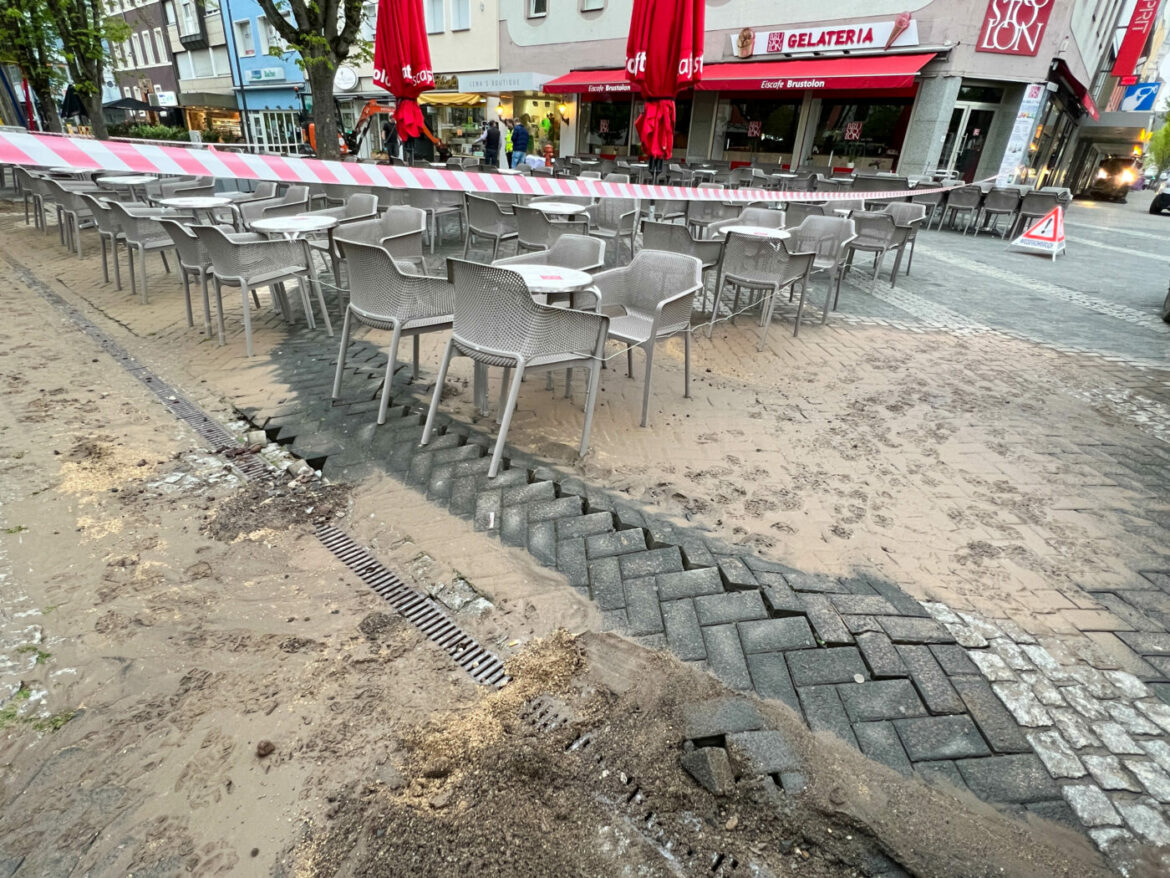Die Folgen des Rohrbruchs sind jedoch enorm. Durch den Wasserdruck hat sich auf einer großen Fläche das Pflaster gehoben oder abgesenkt. „Wir haben es hier mit starken Unterspülungen zu tun. Das hängt auch damit zusammen, dass das Pflaster in Beton verlegt wurde. Das heißt: Die Fläche muss komplett abgetragen werden. Der Unterbau muss neu erstellt, die Oberfläche 30 Zentimeter tief aufgemacht und eine Baufirma beauftragt werden, die das Pflaster vollständig verlegt. Das geht nicht von einem auf den anderen Tag“, erklärt Bereichsleiter Peter Dunkel von den SWN.